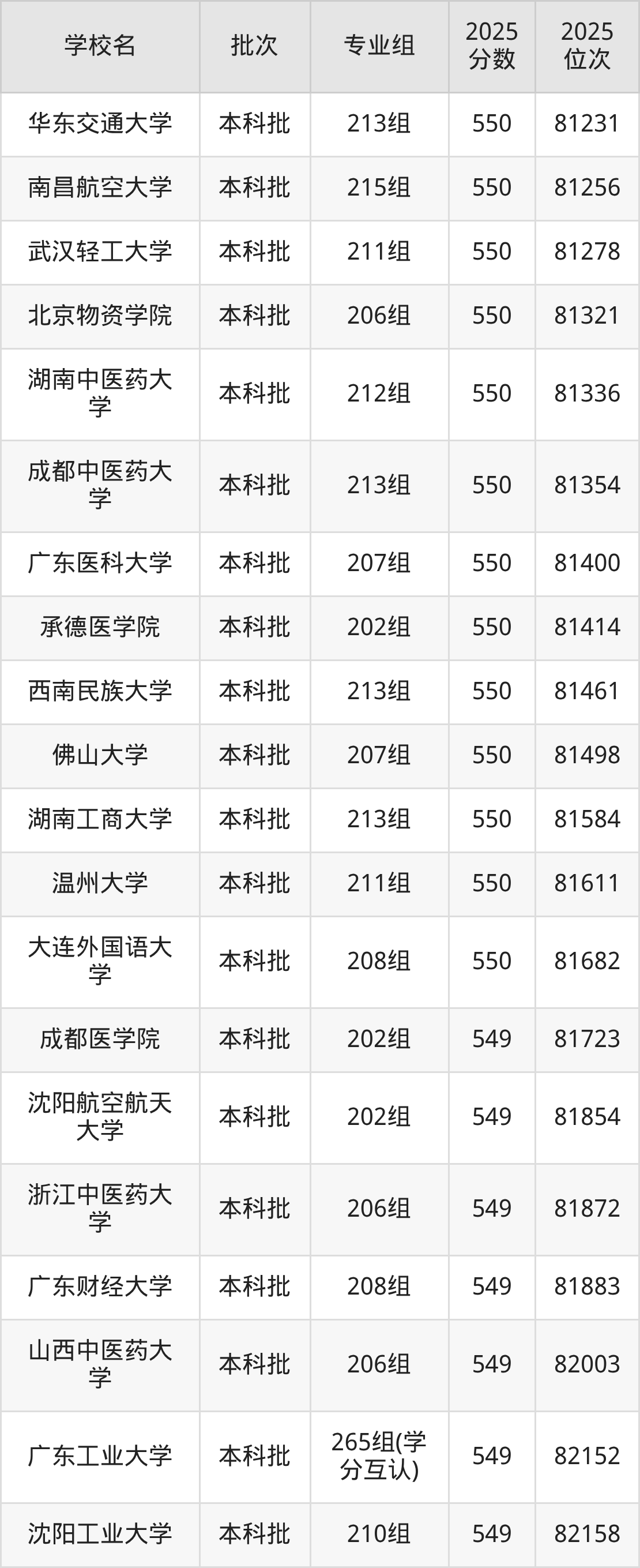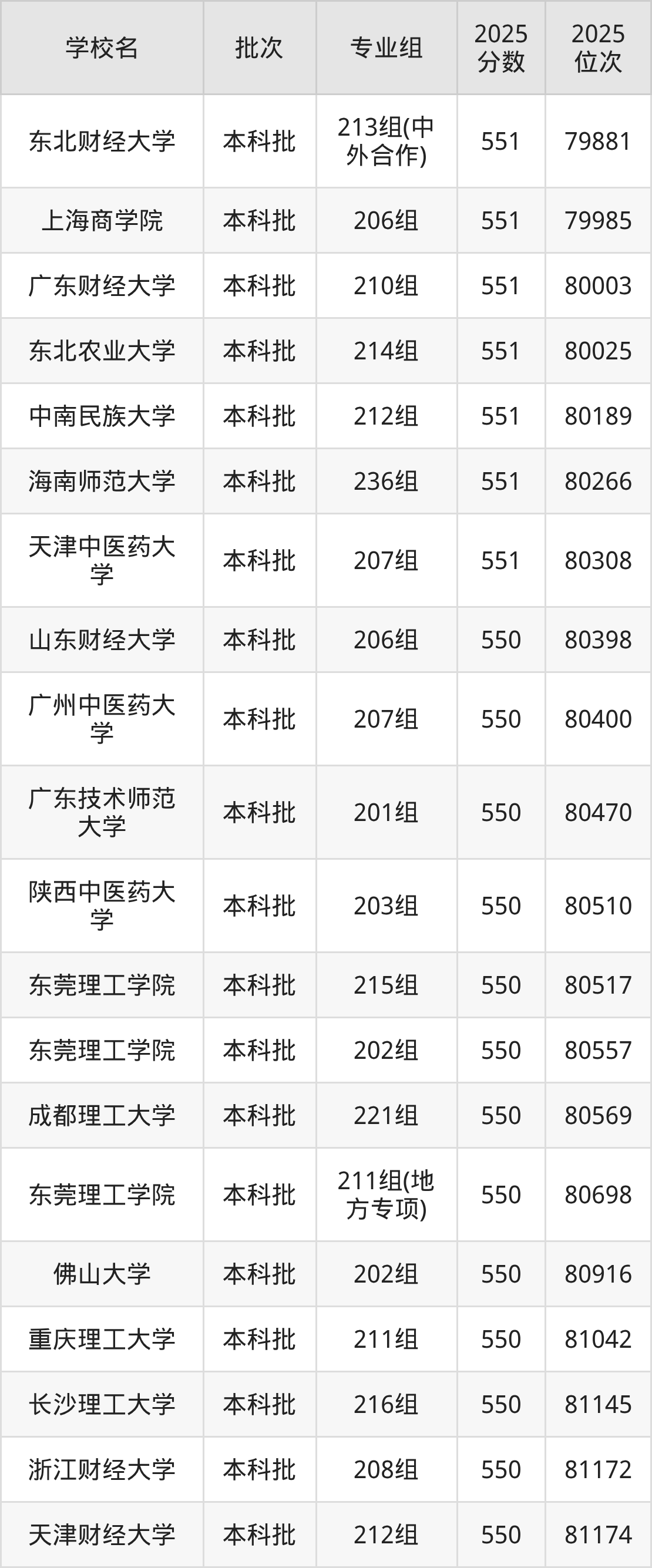 2025年广东高考物理类550分(80320名~81695名)能上的大学有北京物资学院206组、天津财经大学212组、承德医学院202组、大连外国语大学208组等。