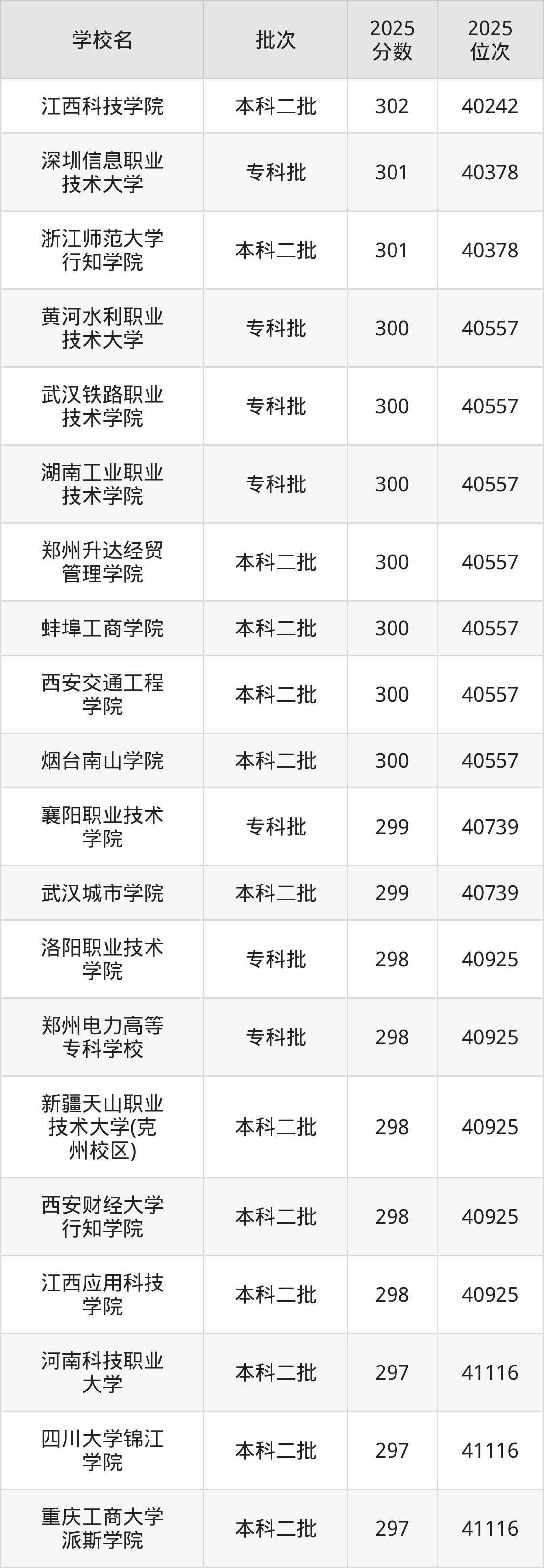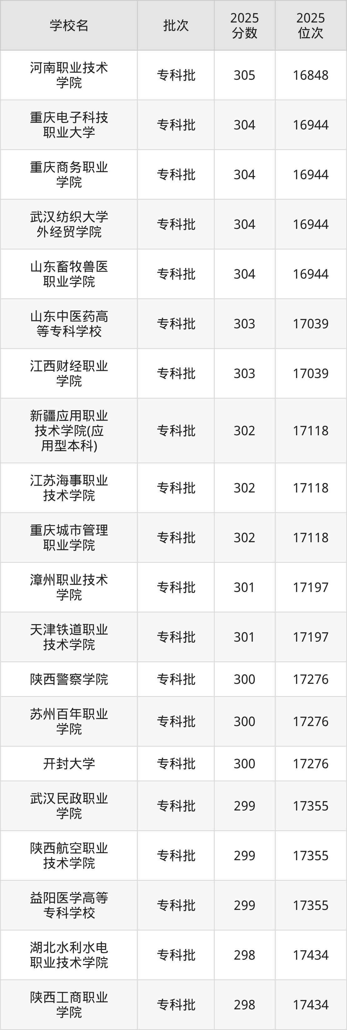 2025年新疆高考文科299分(17277名~17355名)能上的大学有陕西航空职业技术学院、武汉民政职业学院、益阳医学高等专科学校。