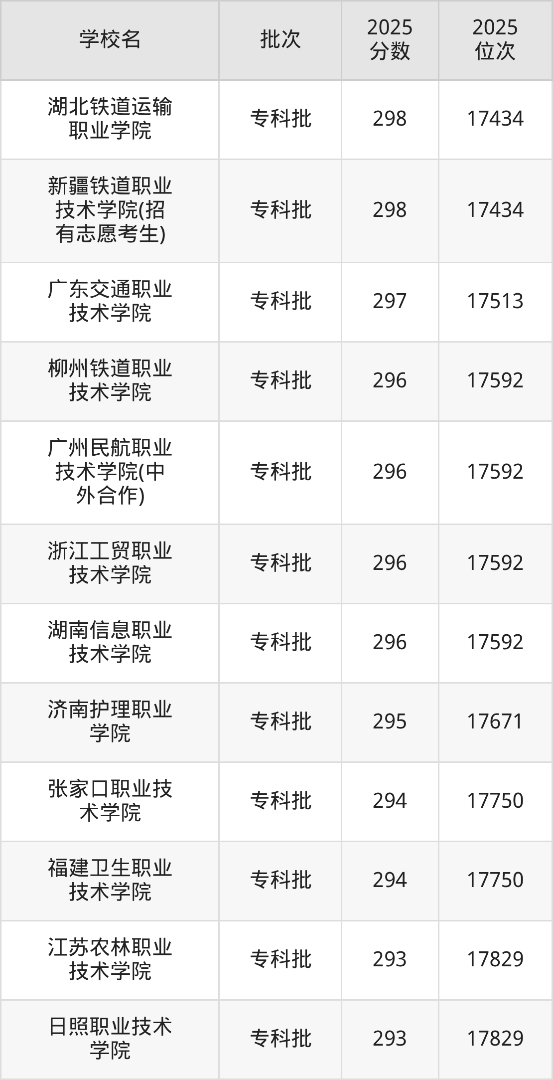 另外录取位次低于该区间(较稳妥)的有新疆铁道职业技术学院(招有志愿考生)(17434名)、湖北铁道运输职业学院(17434名)等;录取位次高于该区间(可冲)的有陕西警察学院(17276名)、苏州百年职业学院(17276名)等。