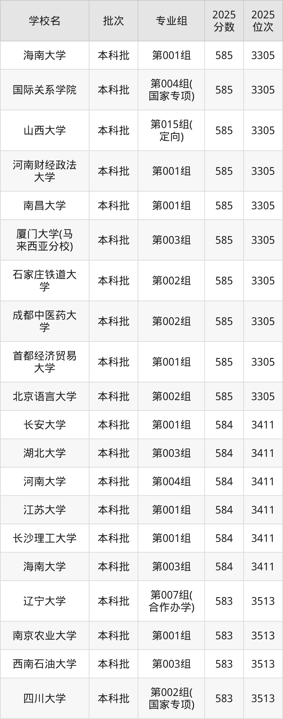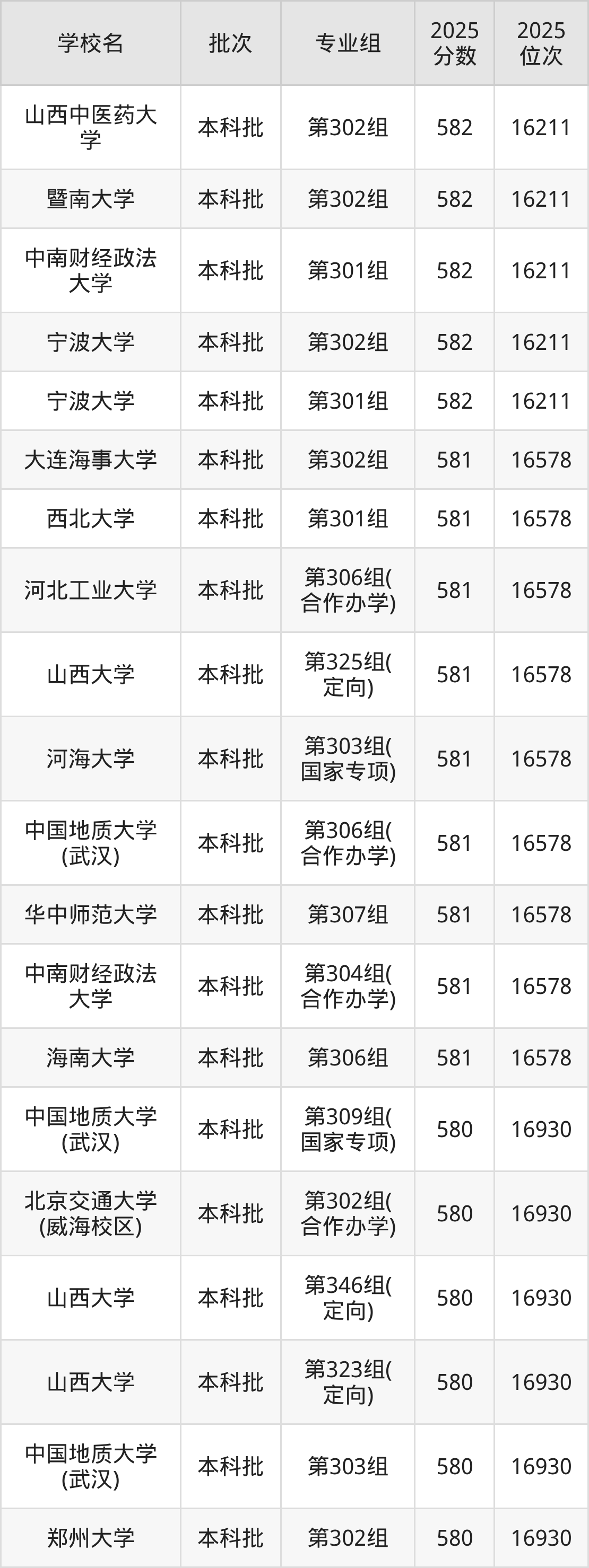 2025年山西高考物理类580分(16579名~16930名)能上的大学有首都经济贸易大学第302组、北京信息科技大学第304组(国家专项)、中国石油大学(华东)第303组(国家专项)、山东第一医科大学第301组等。