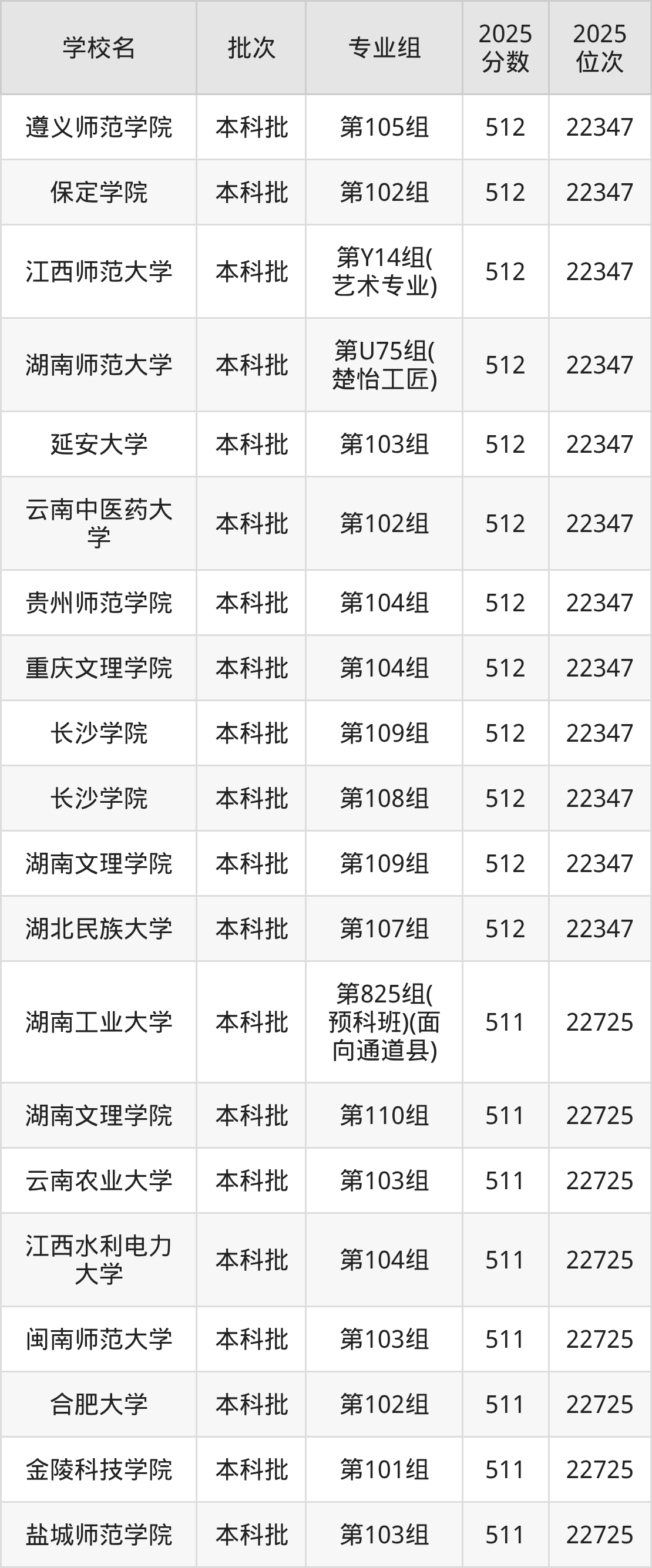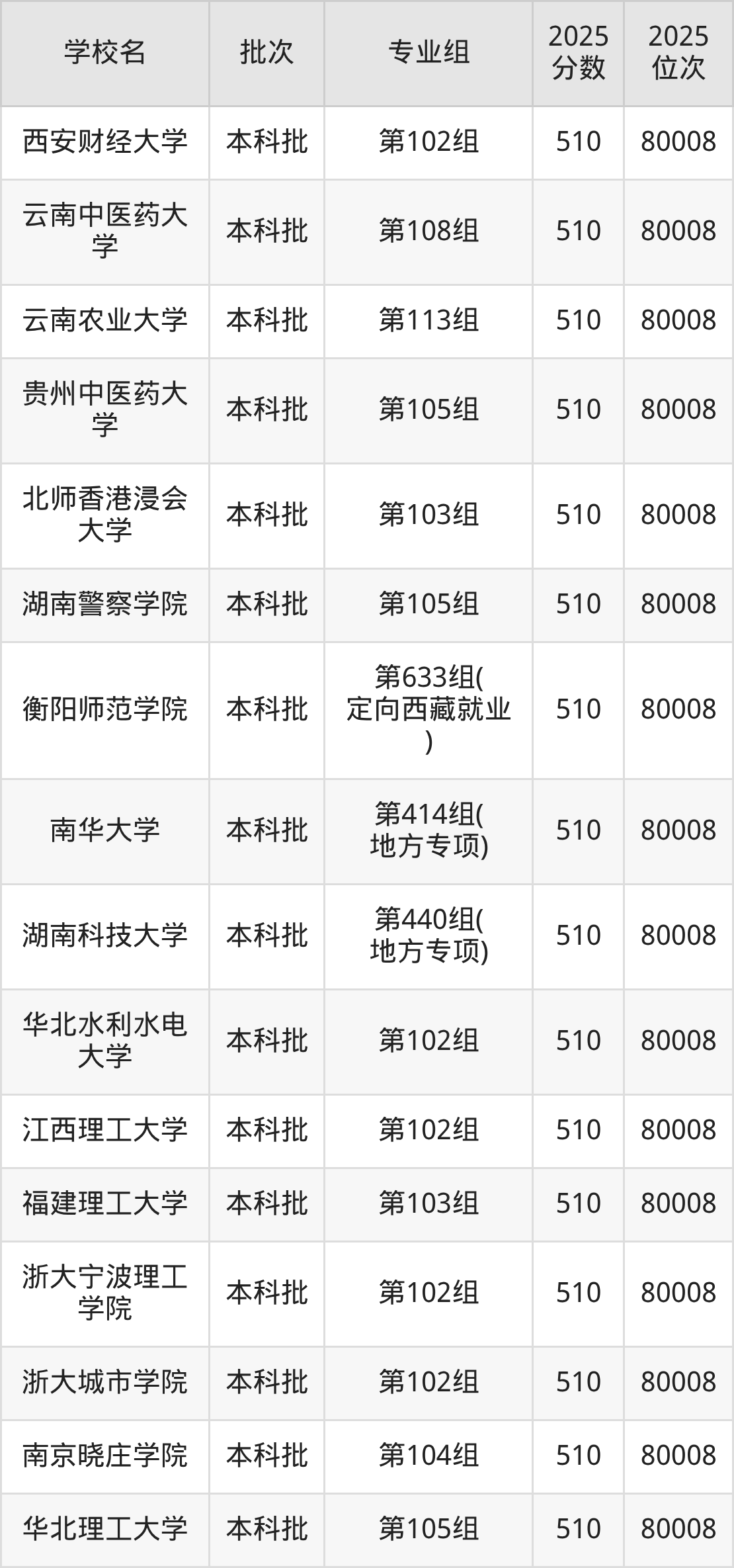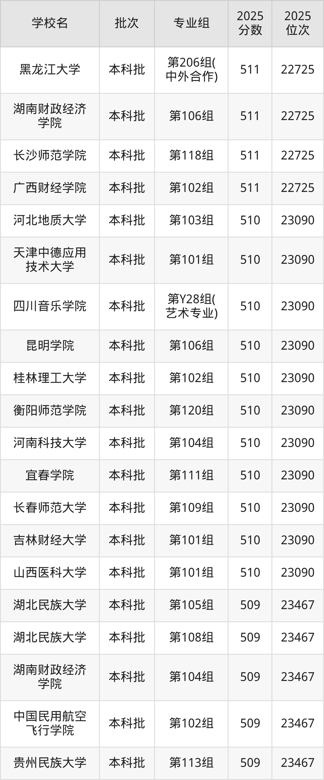 2025年湖南高考历史类510分(22726名~23090名)能上的大学有天津中德应用技术大学第101组、河北地质大学第103组、山西医科大学第101组、吉林财经大学第101组等。