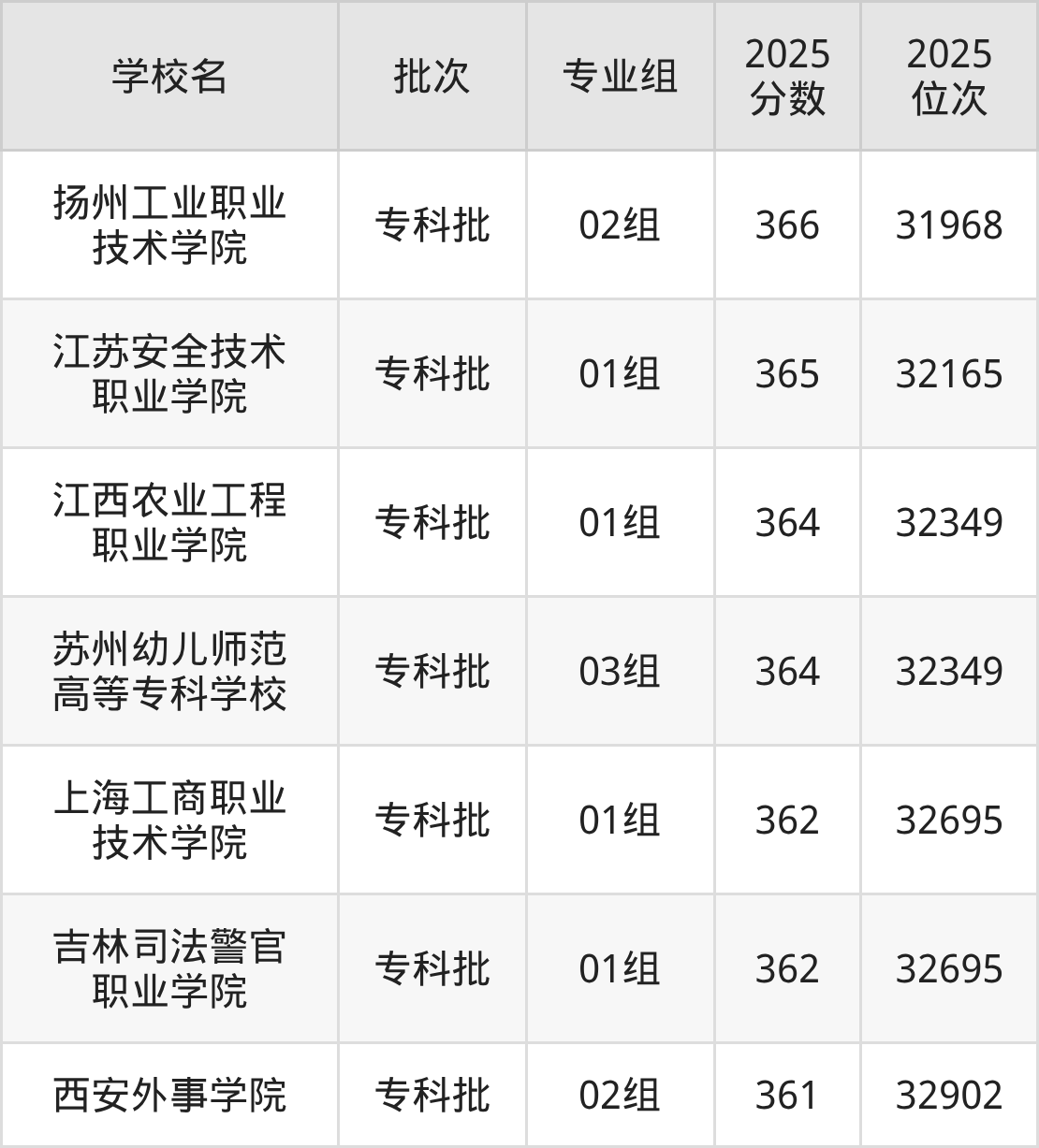 2025年江苏高考历史类363分(32350名~32522名)录取位次低于该区间(较稳妥)的有吉林司法警官职业学院01组(32695名)、上海工商职业技术学院01组(32695名)等;录取位次高于该区间(可冲)的有苏州幼儿师范高等专科学校03组(32349名)、江西农业工程职业学院01组(32349名)等。