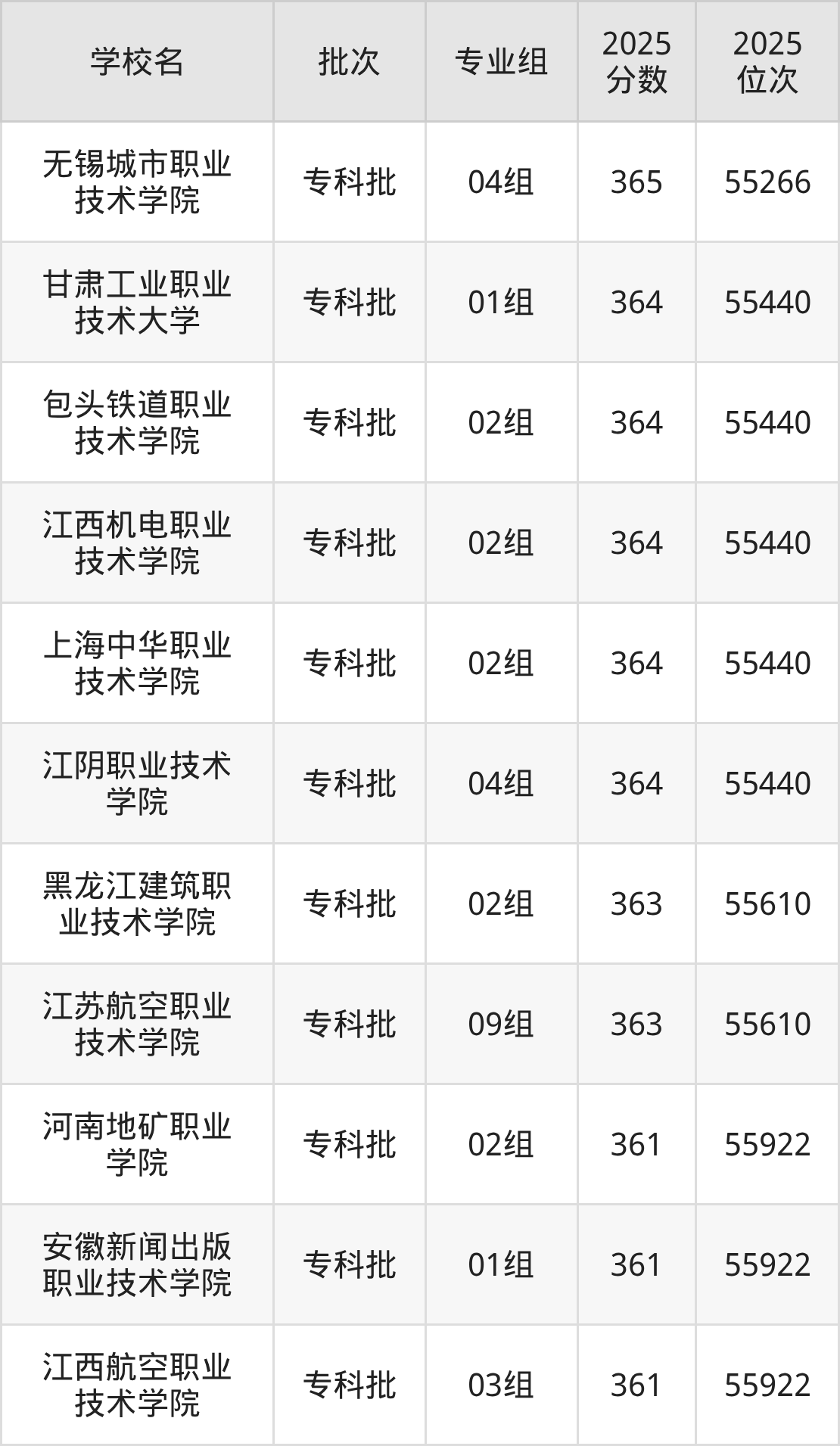 2025年江苏高考物理类363分(55441名~55610名)能上的大学有江苏航空职业技术学院09组、黑龙江建筑职业技术学院02组。