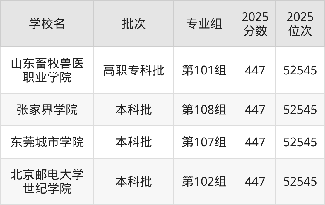 2025年湖南高考历史类447分(51976名~52545名)能上的大学有北京邮电大学世纪学院第102组、东莞城市学院第107组、张家界学院第108组、山东畜牧兽医职业学院第101组。