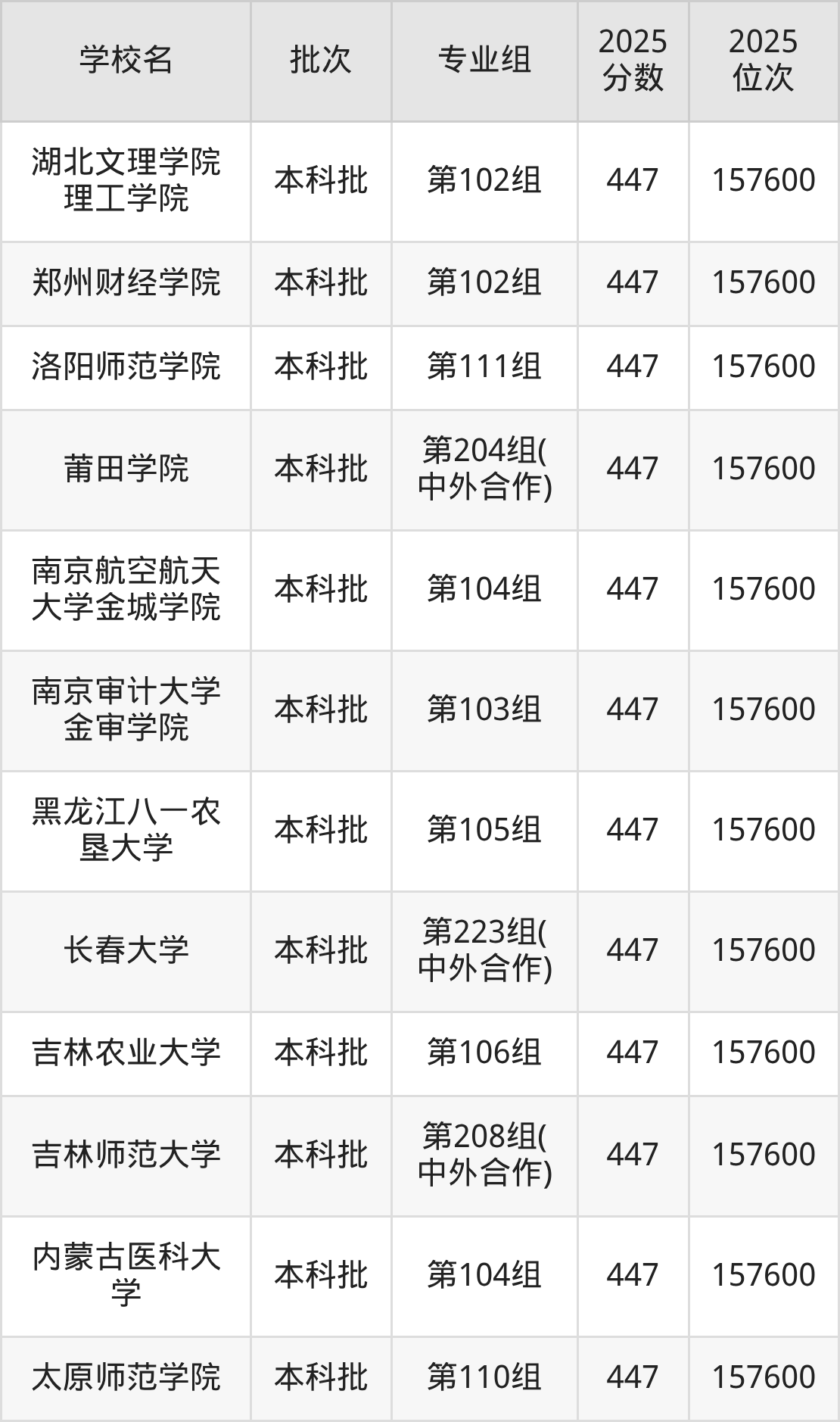 2025年湖南高考物理类447分(156273名~157600名)能上的大学有太原师范学院第110组、内蒙古医科大学第104组、吉林师范大学第208组(中外合作)、吉林农业大学第106组等。