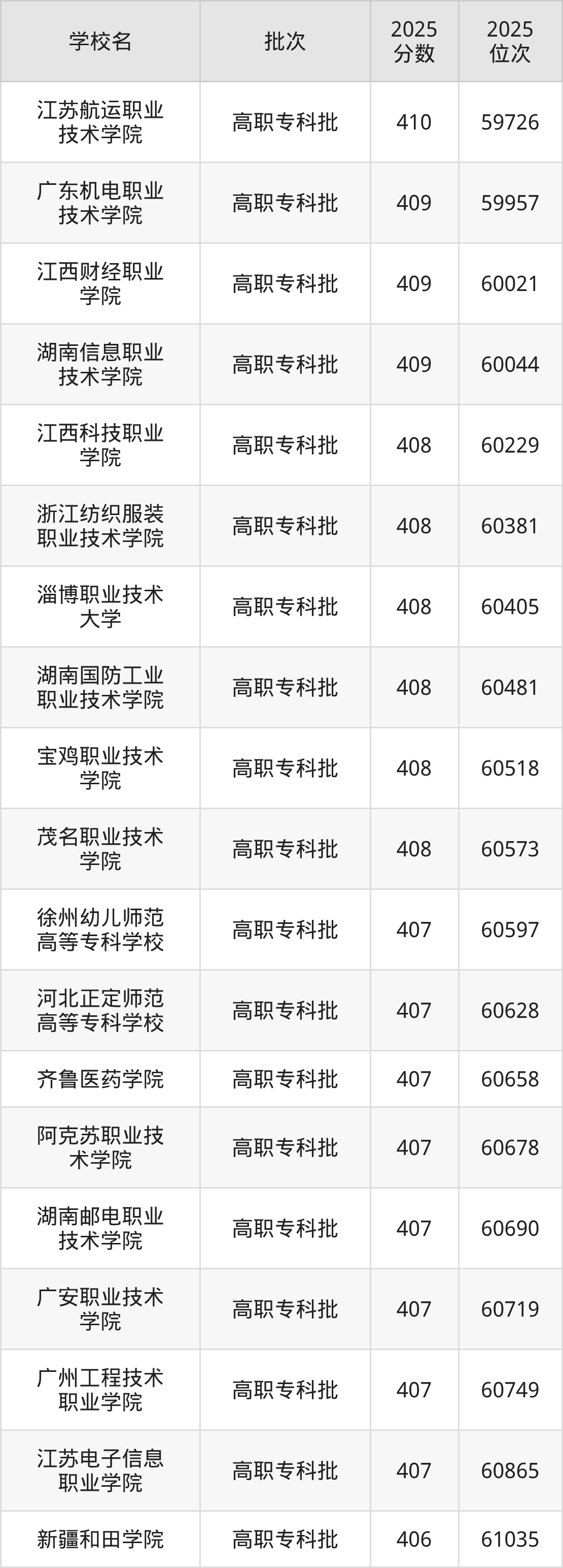 2025年贵州高考历史类408分(60180名~60583名)能上的大学有宝鸡职业技术学院、茂名职业技术学院、淄博职业技术大学、浙江纺织服装职业技术学院等。