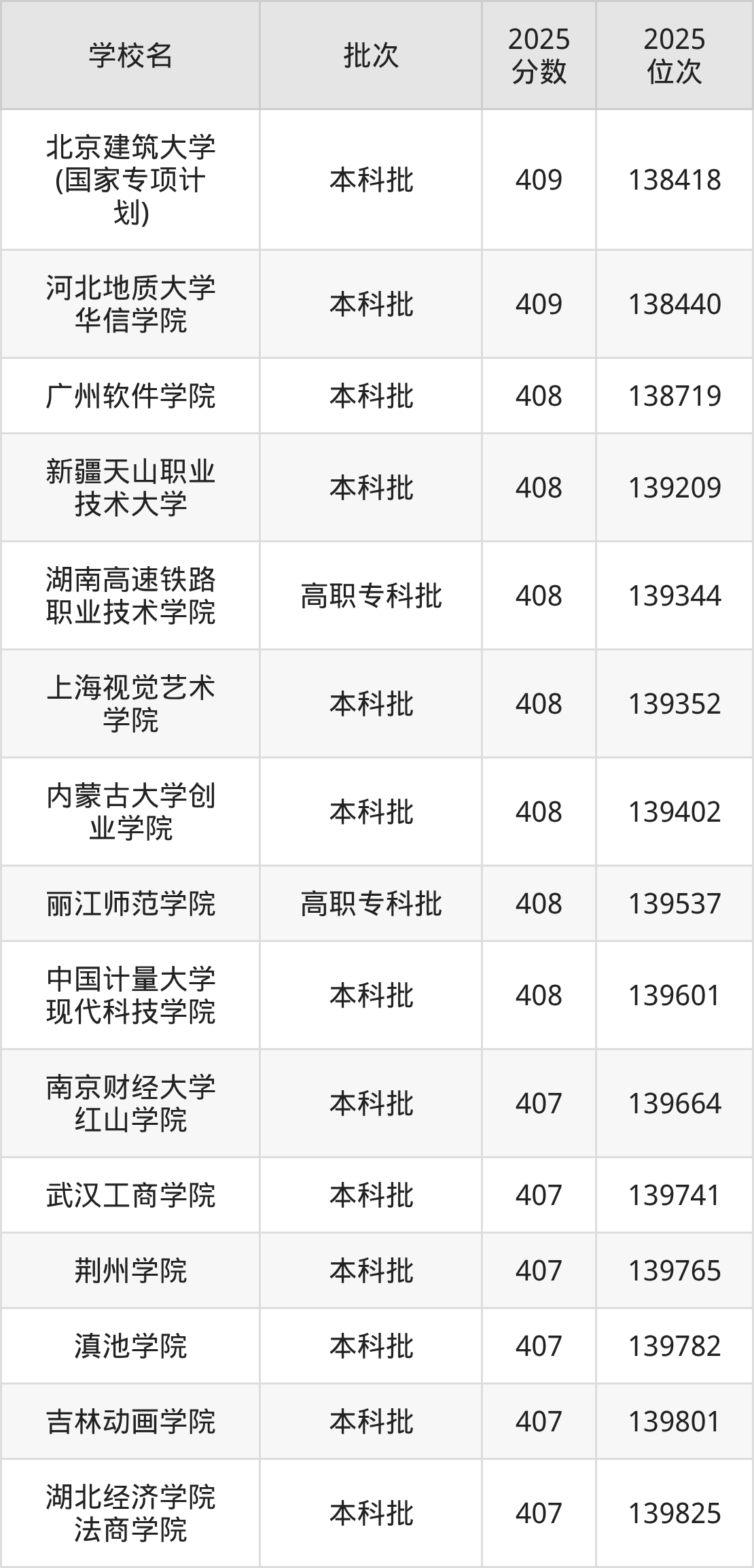 2025年贵州高考物理类408分(138666名~139622名)能上的大学有上海视觉艺术学院、内蒙古大学创业学院、丽江师范学院、新疆天山职业技术大学等。