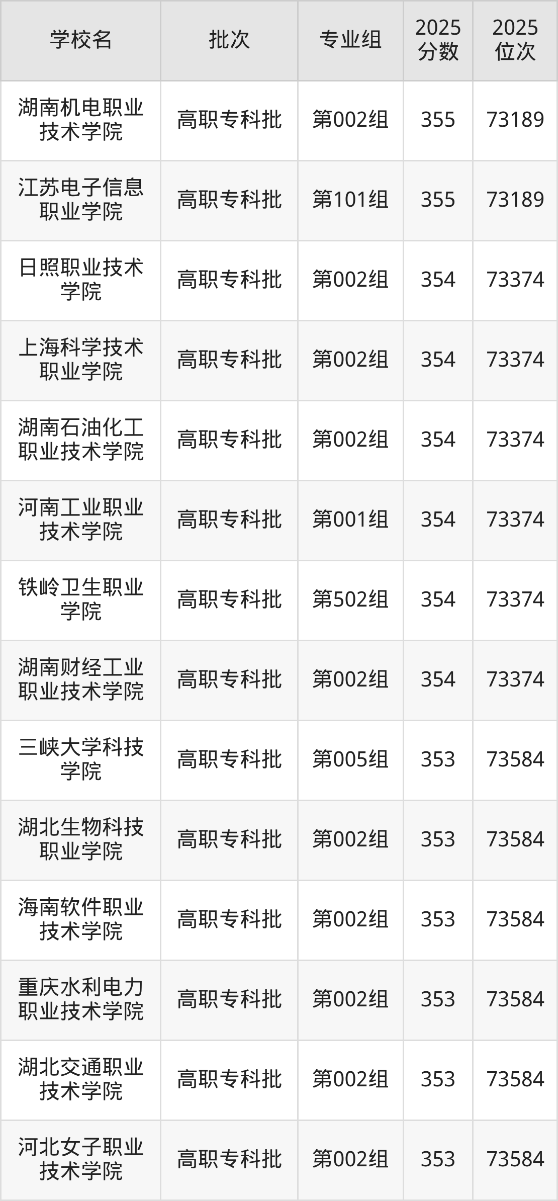 另外录取位次低于该区间(较稳妥)的有湖南财经工业职业技术学院第002组(73374名)、铁岭卫生职业学院第502组(73374名)等;录取位次高于该区间(可冲)的有辽宁轻工职业学院第001组(72980名)、仙桃职业学院第002组(72980名)等。