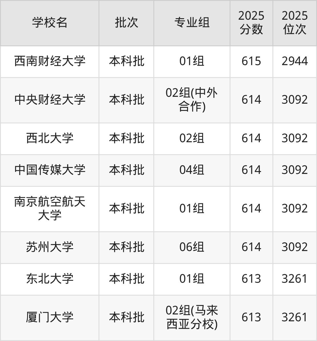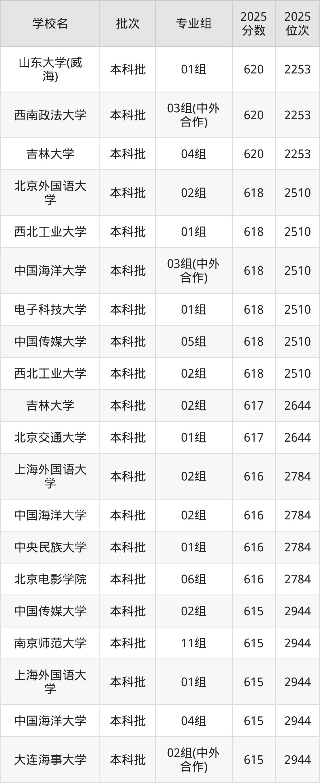2025年江苏高考历史类616分(2645名~2784名)能上的大学有上海外国语大学02组、中国海洋大学02组、中央民族大学01组、北京电影学院06组。