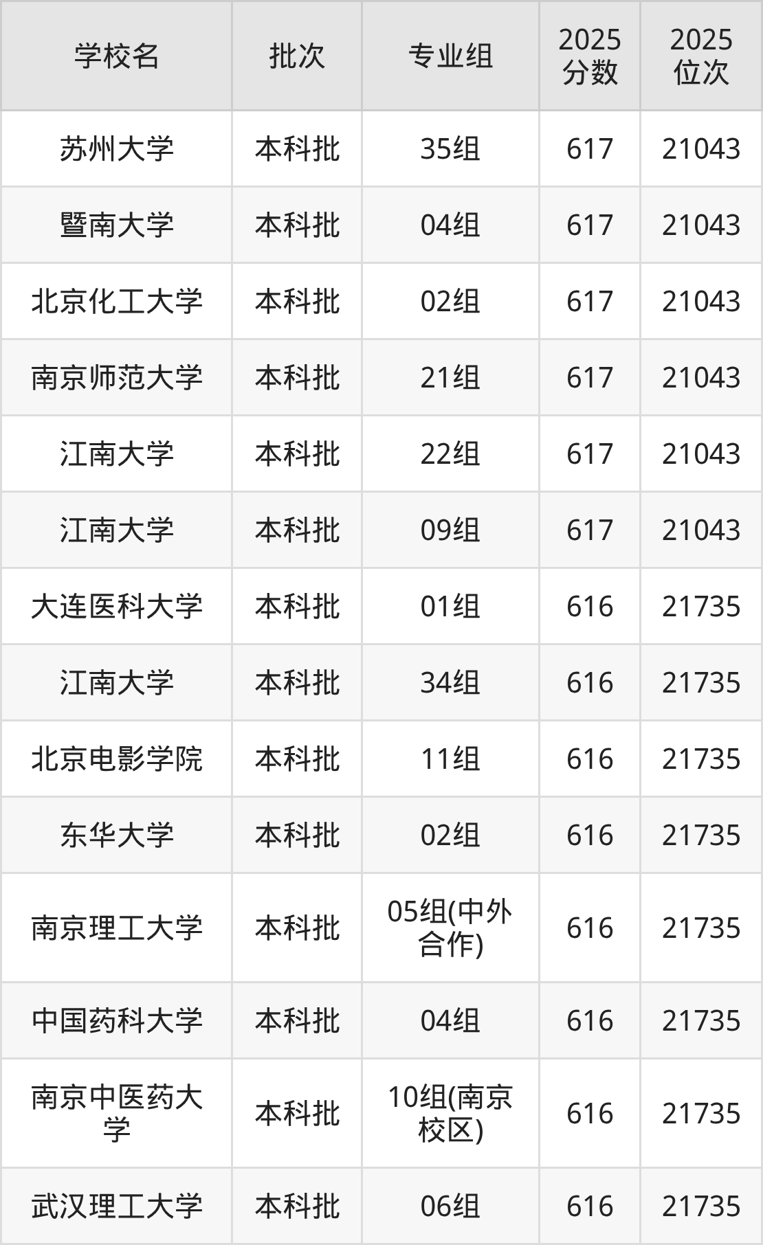2025年江苏高考物理类616分(21044名~21735名)能上的大学有南京理工大学05组(中外合作)、中国药科大学04组、南京中医药大学10组(南京校区)、江南大学34组等。