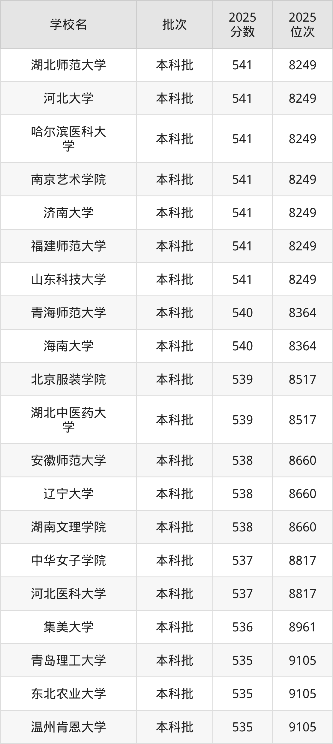 2025年辽宁高考历史类537分(8661名~8817名)能上的大学有中华女子学院、河北医科大学。