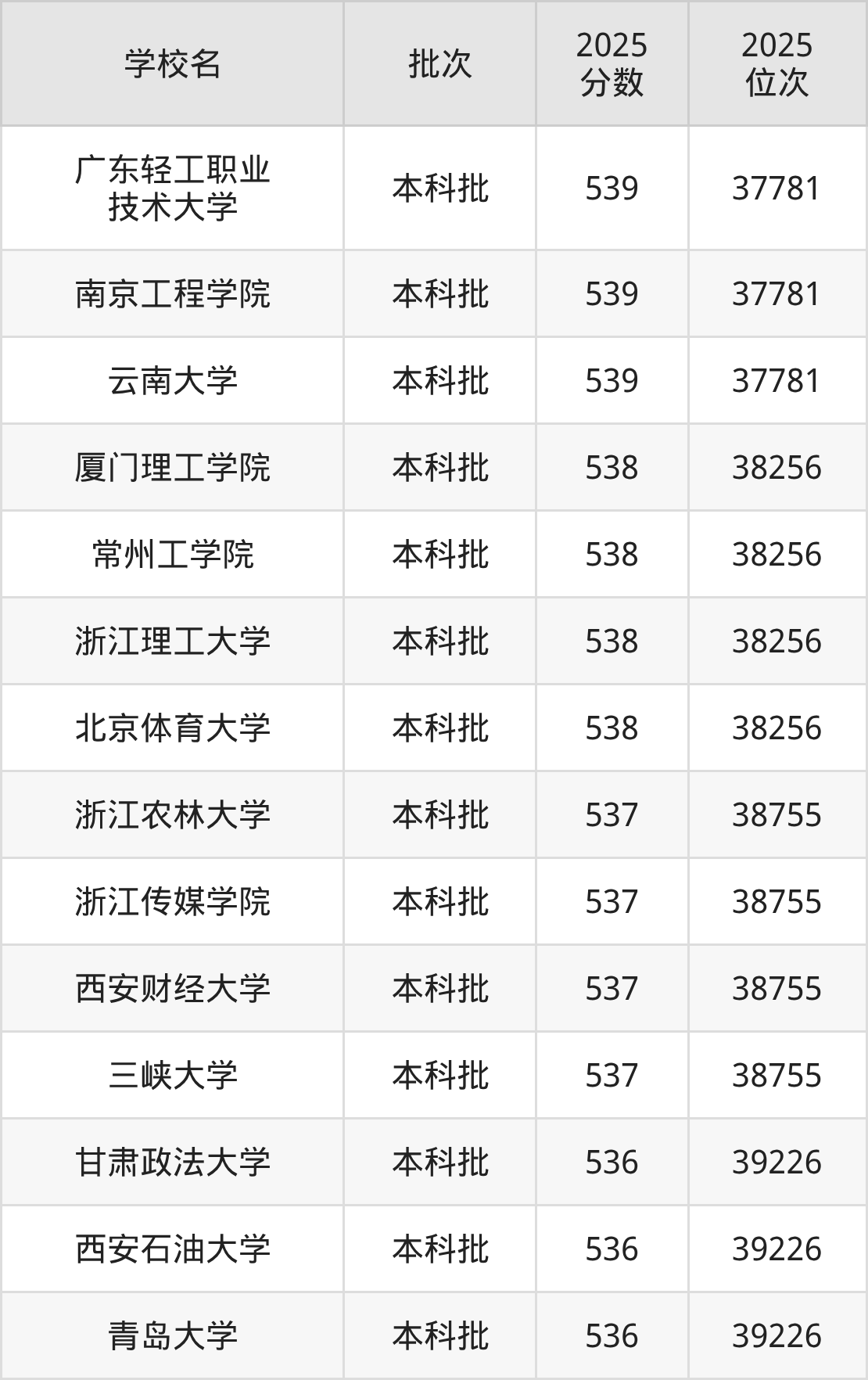 2025年辽宁高考物理类537分(38257名~38755名)能上的大学有三峡大学、浙江农林大学、西安财经大学、浙江传媒学院。