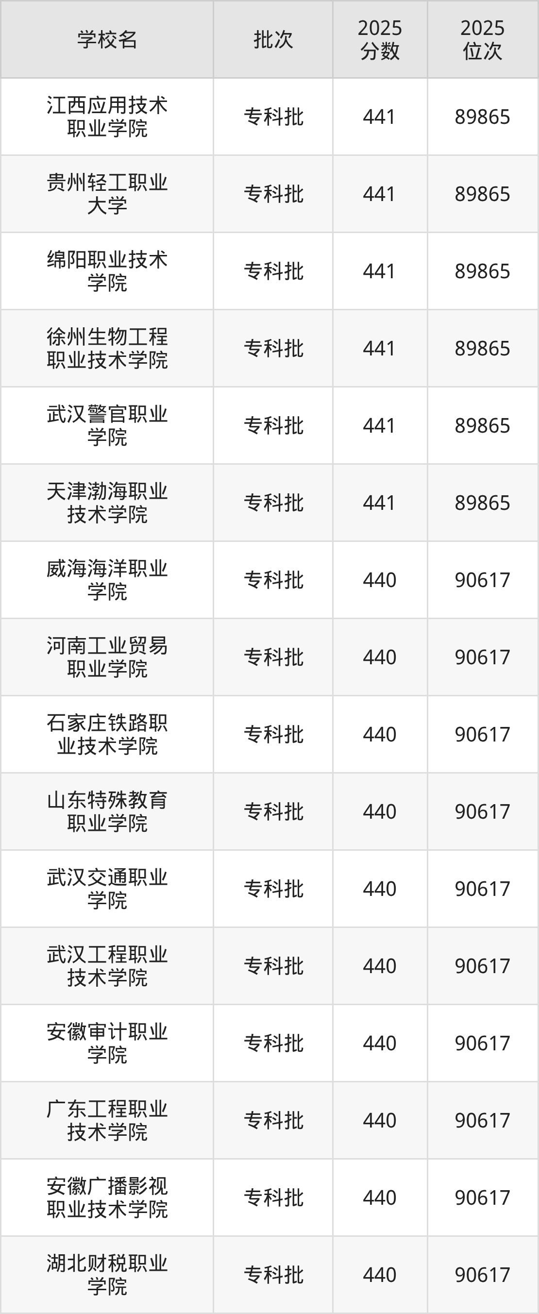 2025年河北高考历史类440分(89866名~90617名)能上的大学有安徽审计职业学院、河南工业贸易职业学院、威海海洋职业学院、湖北财税职业学院等。