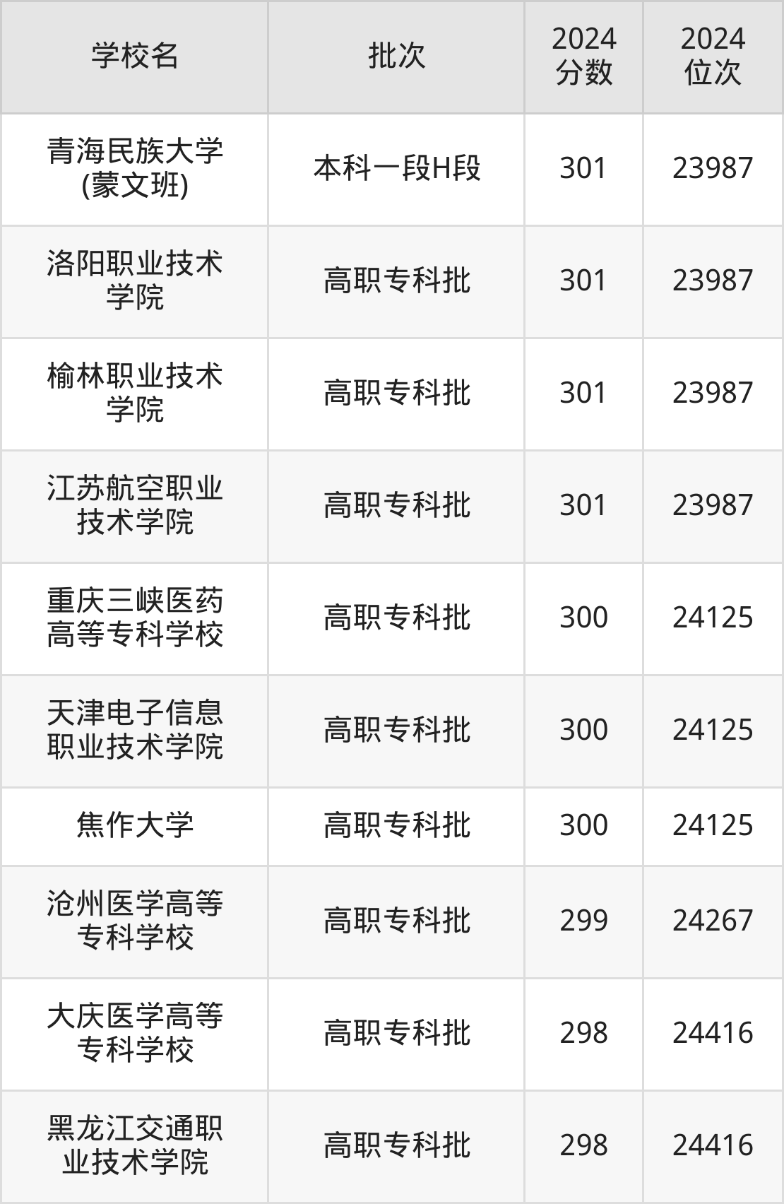 2024年青海高考理科301分(23843名~23987名)能上的大学有榆林职业技术学院、江苏航空职业技术学院、洛阳职业技术学院、青海民族大学(蒙文班)。