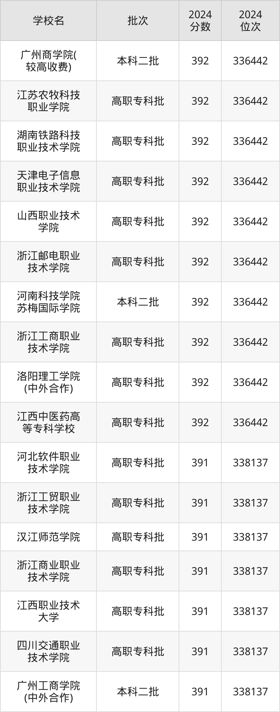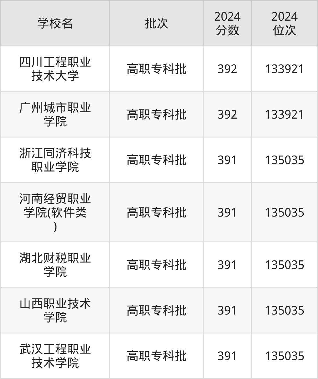 2024年河南高考文科391分(133922名~135035名)能上的大学有山西职业技术学院、湖北财税职业学院、浙江同济科技职业学院、武汉工程职业技术学院等。