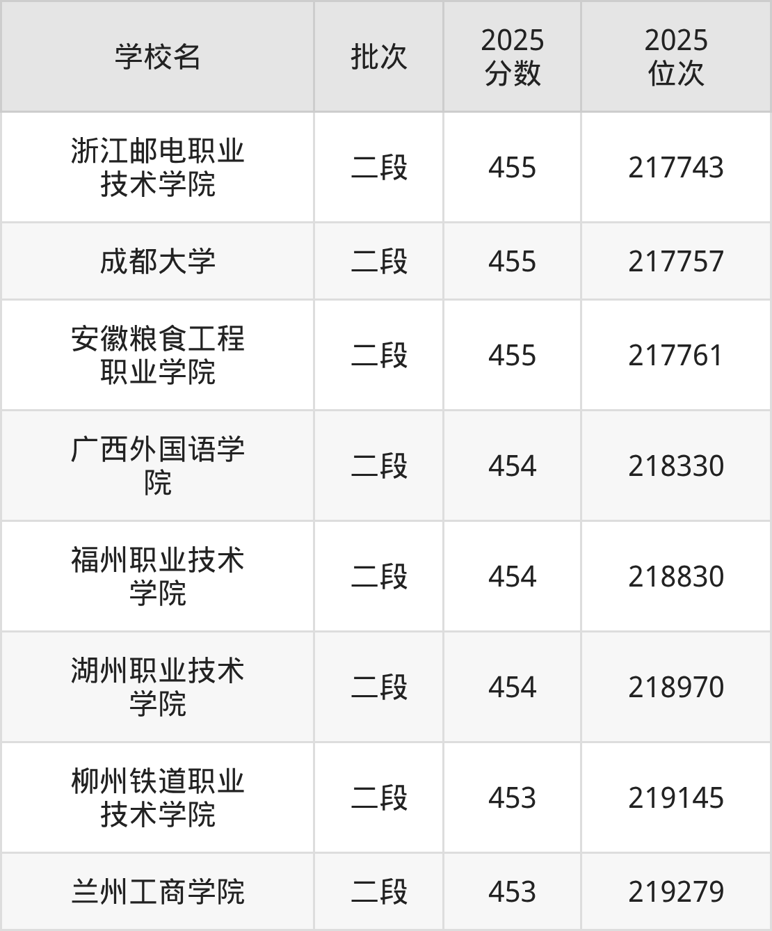 2025年浙江高考454分(218244名~219114名)能上的大学有湖州职业技术学院、福州职业技术学院、广西外国语学院。