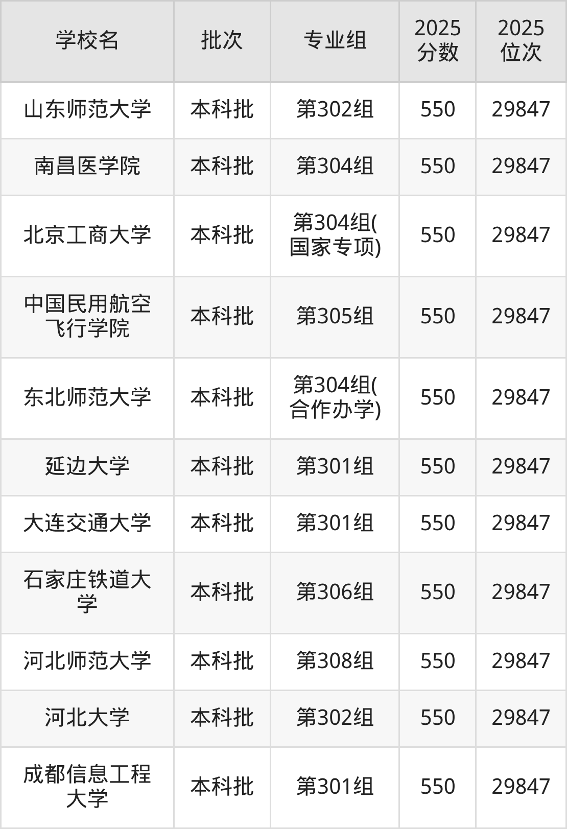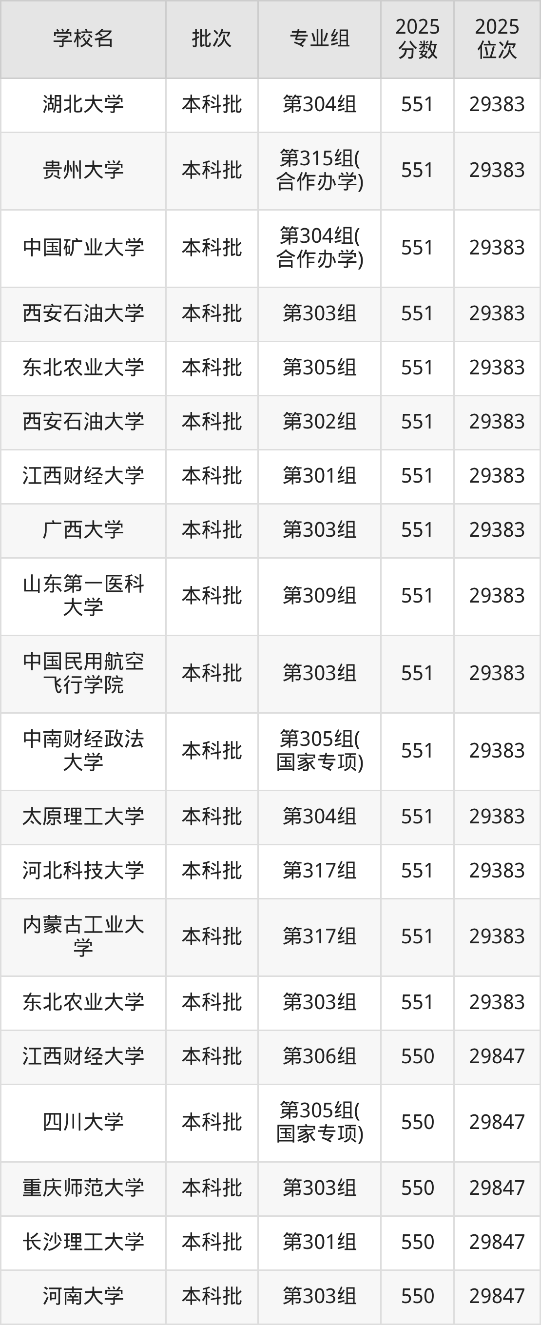 2025年山西高考物理类551分(28894名~29383名)能上的大学有河北科技大学第317组、内蒙古工业大学第317组、东北农业大学第303组、东北农业大学第305组等。