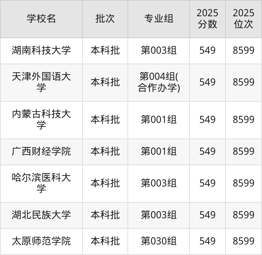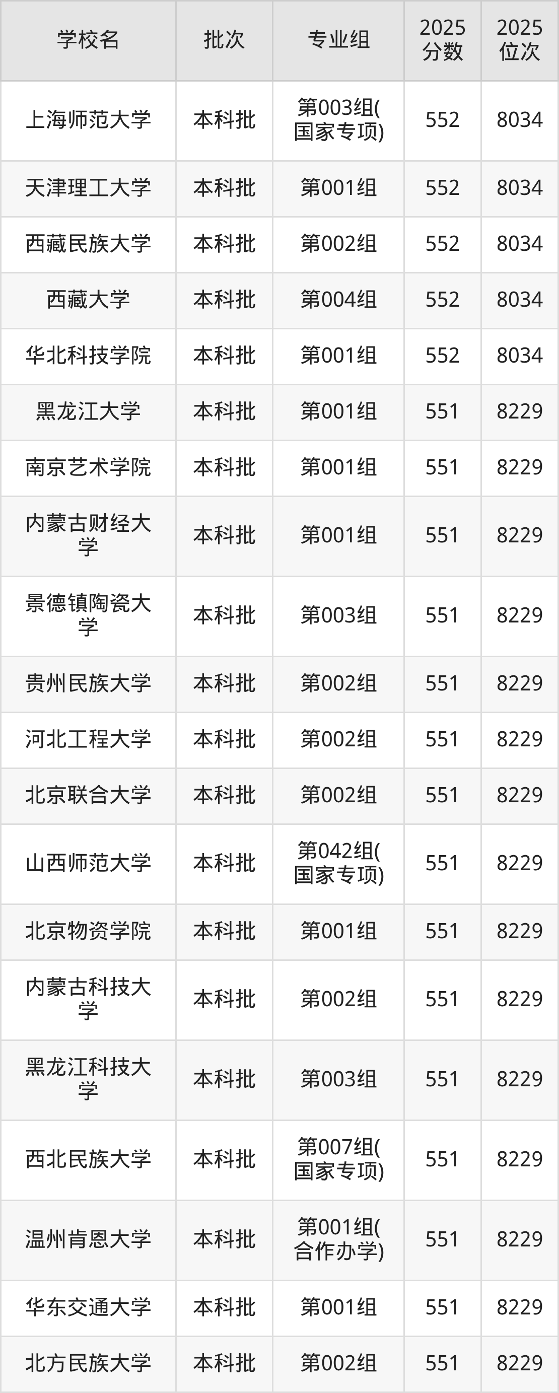 2025年山西高考历史类551分(8035名~8229名)能上的大学有北京物资学院第001组、北京联合大学第002组、河北工程大学第002组、内蒙古科技大学第002组等。