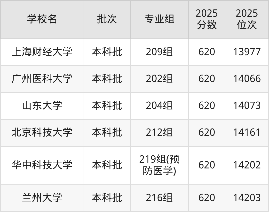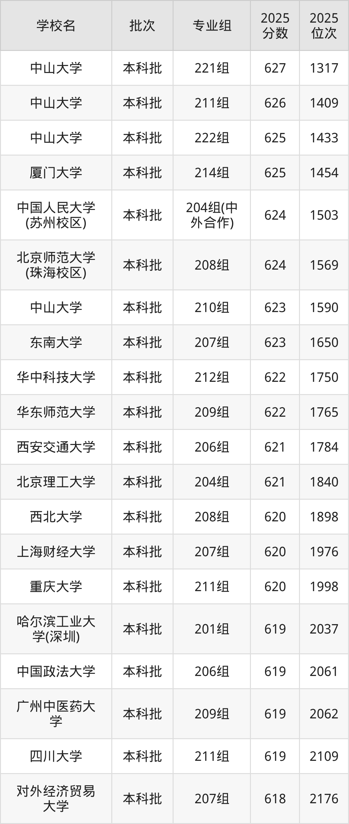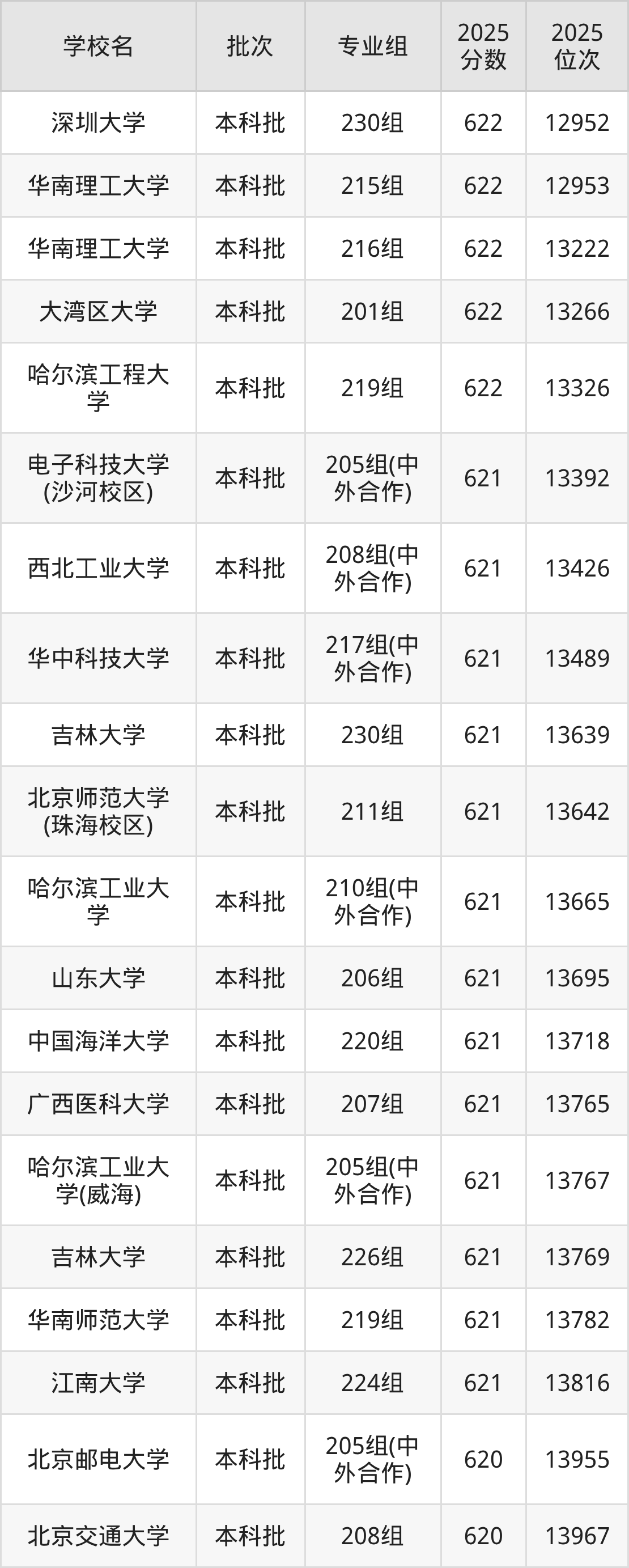 2025年广东高考物理类621分(13377名~13873名)能上的大学有吉林大学226组、吉林大学230组、哈尔滨工业大学210组(中外合作)、江南大学224组等。