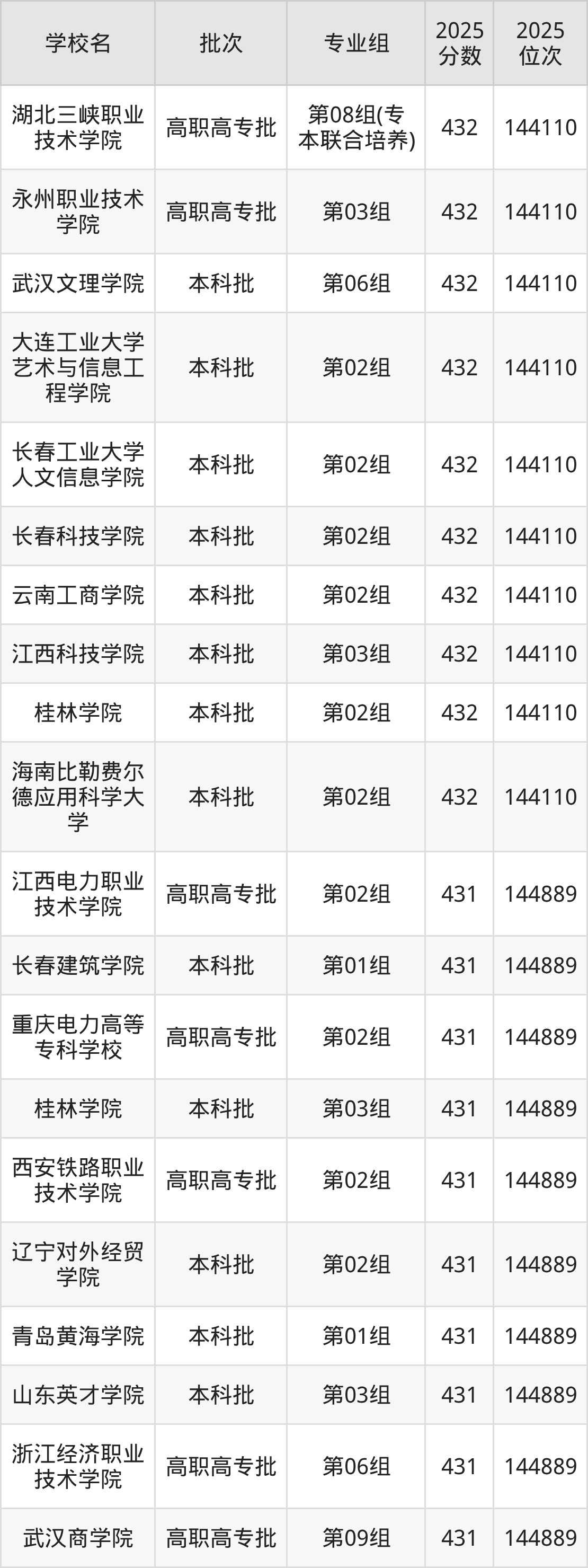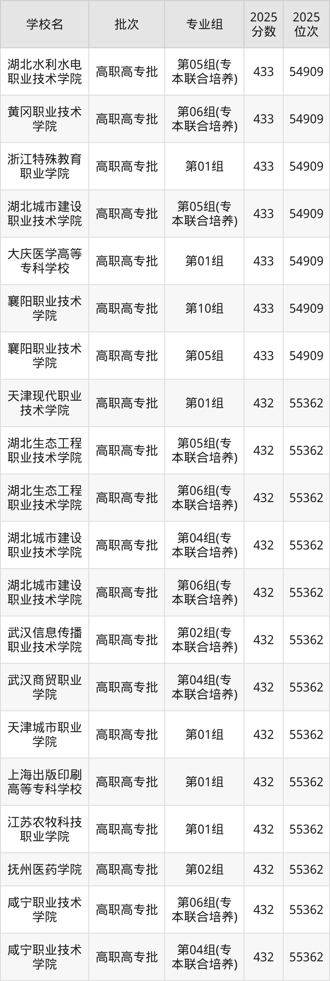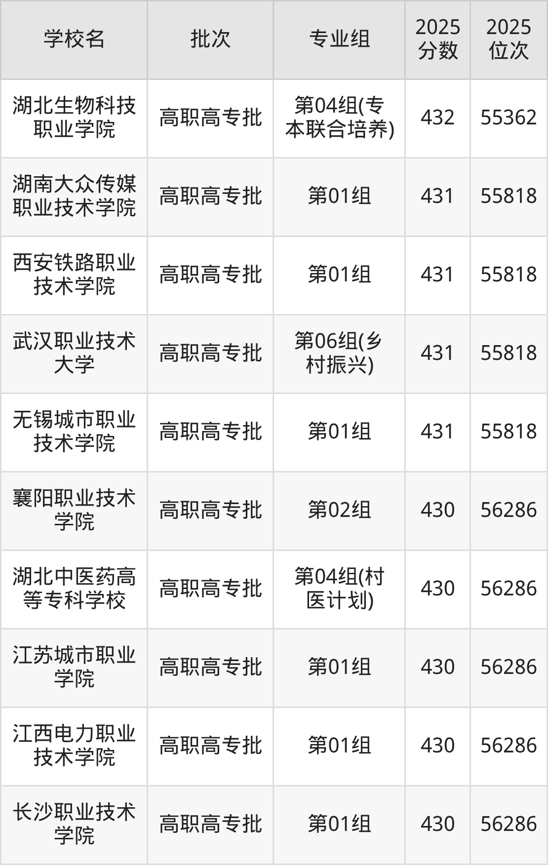 2025年湖北高考历史类431分(55363名~55818名)能上的大学有武汉职业技术大学第06组(乡村振兴)、无锡城市职业技术学院第01组、湖南大众传媒职业技术学院第01组、西安铁路职业技术学院第01组。