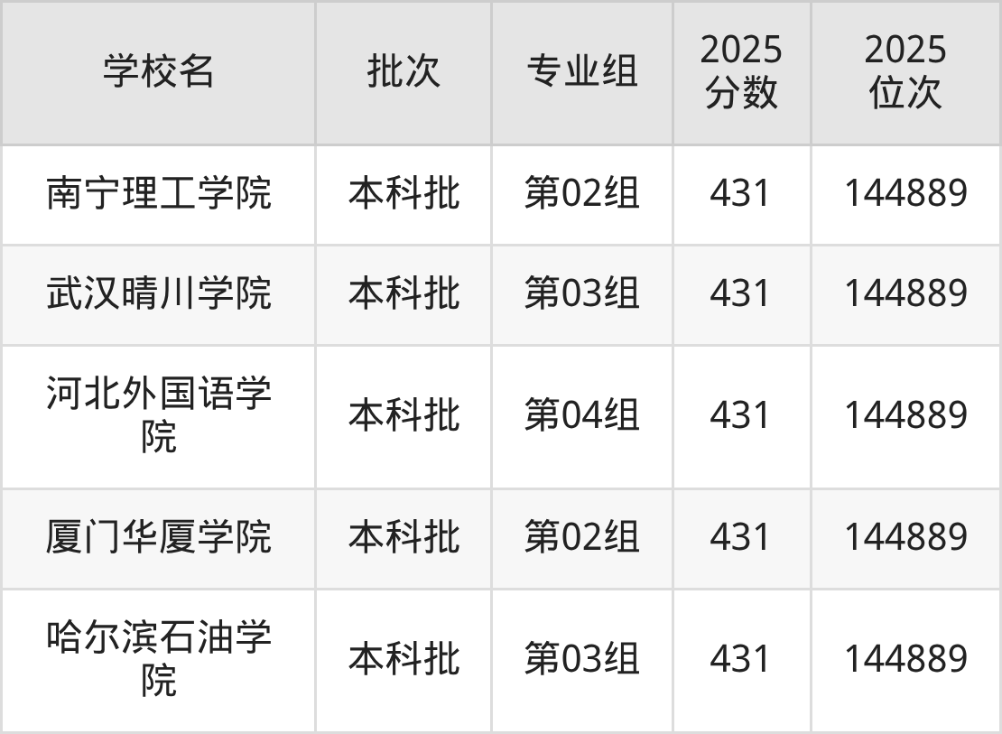 2025年湖北高考物理类431分(144111名~144889名)能上的大学有武汉晴川学院第03组、河北外国语学院第04组、辽宁对外经贸学院第02组、长春建筑学院第01组等。
