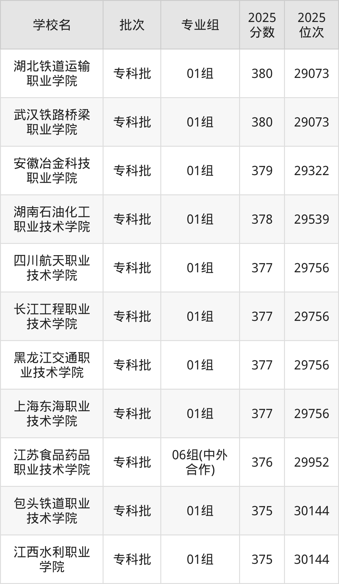 2025年江苏高考历史类377分(29540名~29756名)能上的大学有黑龙江交通职业技术学院01组、长江工程职业技术学院01组、四川航天职业技术学院01组、上海东海职业技术学院01组。