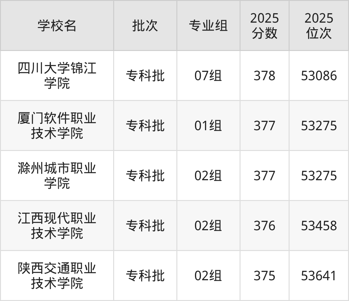 2025年江苏高考物理类377分(53087名~53275名)能上的大学有滁州城市职业学院02组、厦门软件职业技术学院01组。