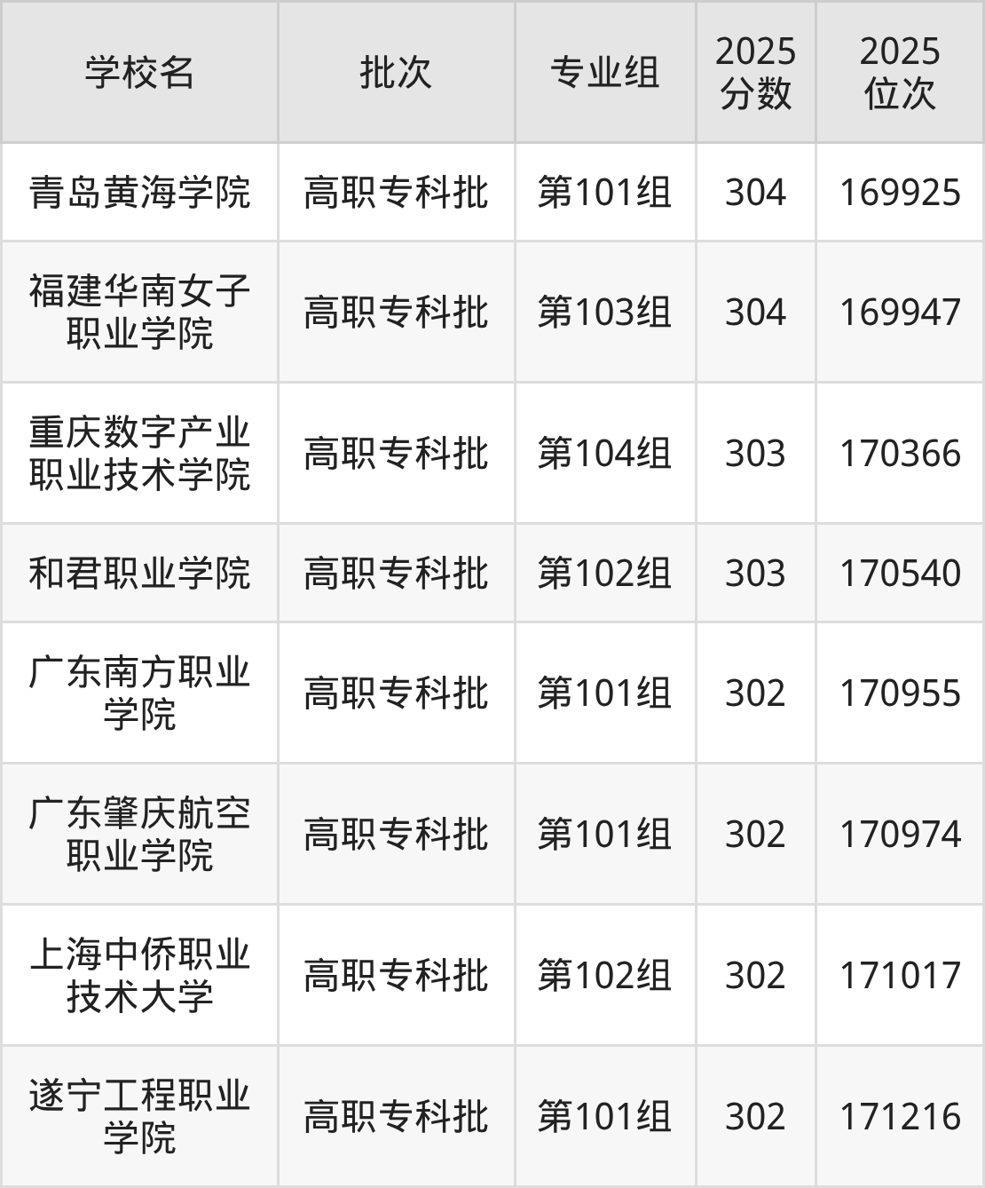 另外录取位次低于该区间(较稳妥)的有广东南方职业学院第101组(170955名)、广东肇庆航空职业学院第101组(170974名)等;录取位次高于该区间(可冲)的有福建华南女子职业学院第103组(169947名)、青岛黄海学院第101组(169925名)等。