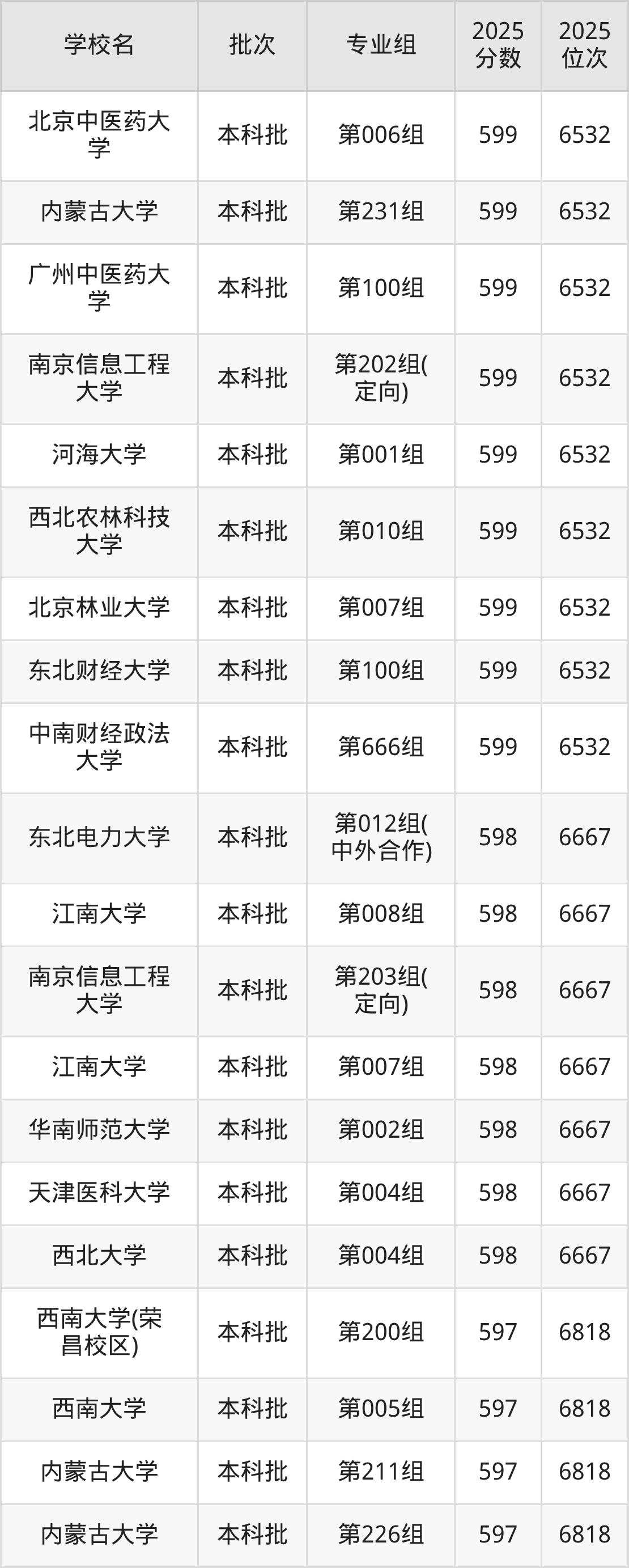 2025年内蒙古高考物理类598分(6533名~6667名)能上的大学有东北电力大学第012组(中外合作)、江南大学第008组、南京信息工程大学第203组(定向)、江南大学第007组等。