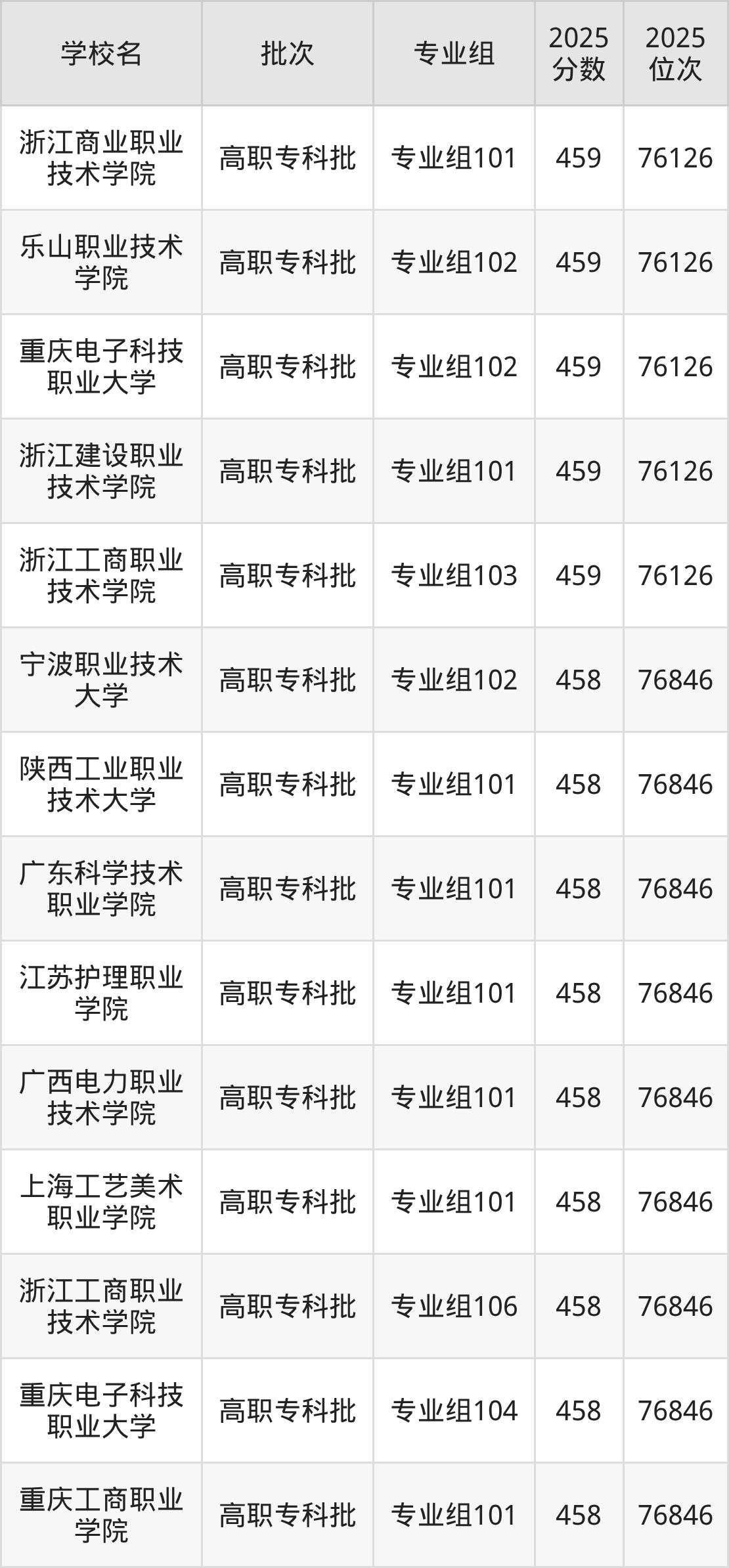 2025年四川高考历史类458分(76127名~76846名)能上的大学有重庆工商职业学院专业组101、重庆电子科技职业大学专业组104、浙江工商职业技术学院专业组106、上海工艺美术职业学院专业组101等。