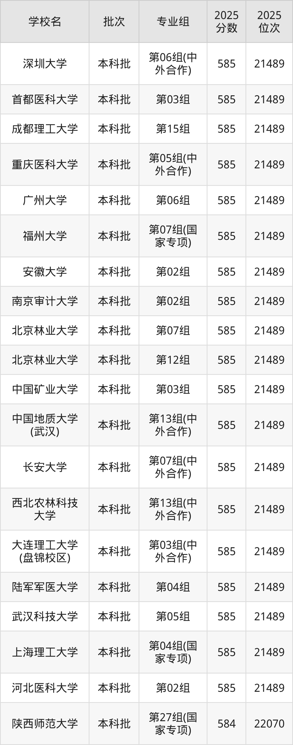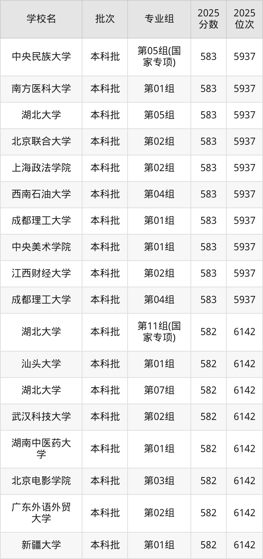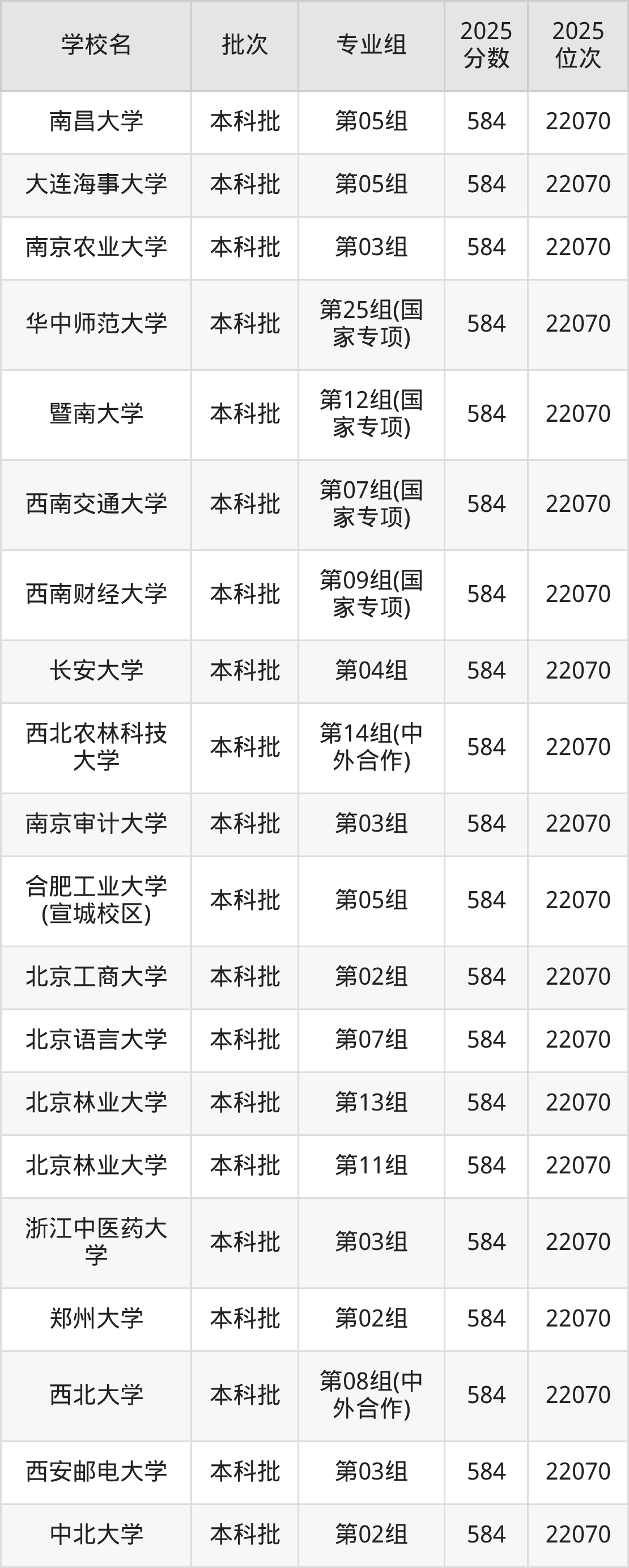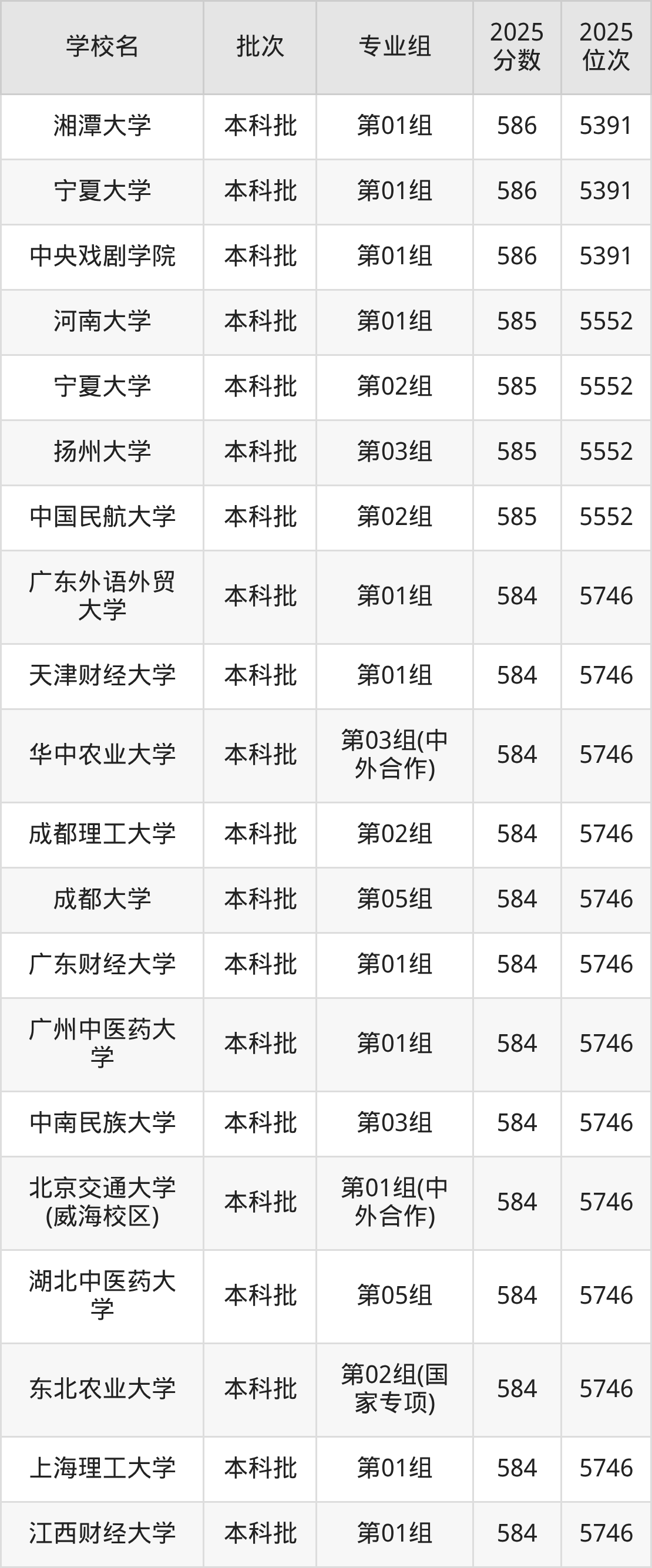 2025年湖北高考历史类584分(5553名~5746名)能上的大学有华中农业大学第03组(中外合作)、中南民族大学第03组、北京交通大学(威海校区)第01组(中外合作)、湖北中医药大学第05组等。