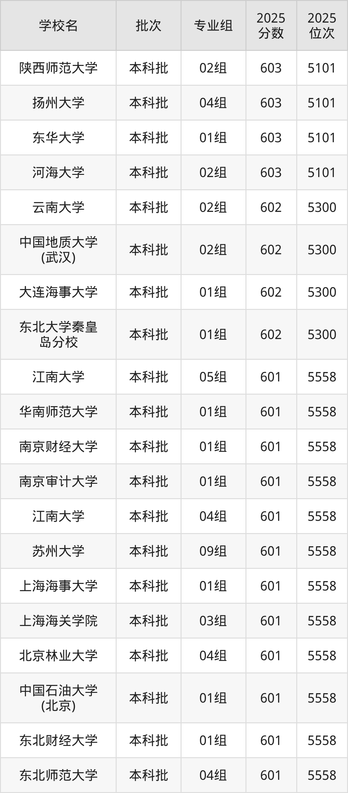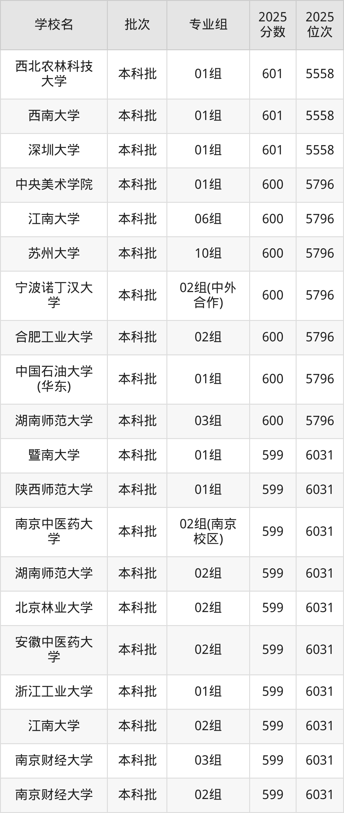 2025年江苏高考历史类600分(5559名~5796名)能上的大学有江南大学06组、苏州大学10组、宁波诺丁汉大学02组(中外合作)、合肥工业大学02组等。