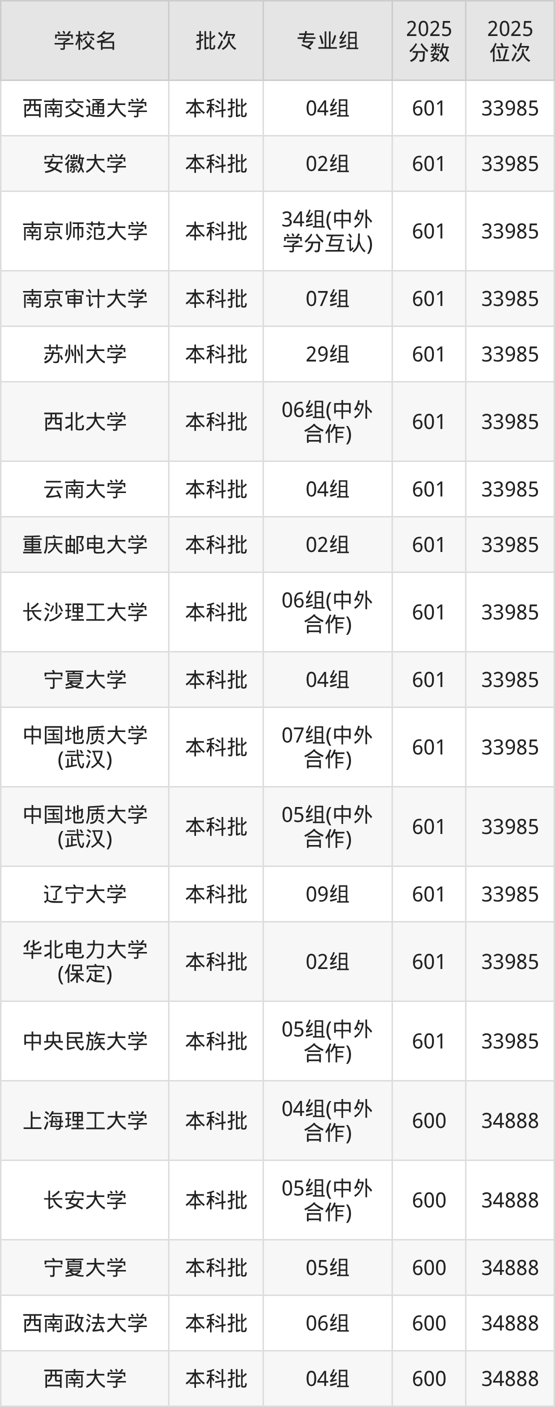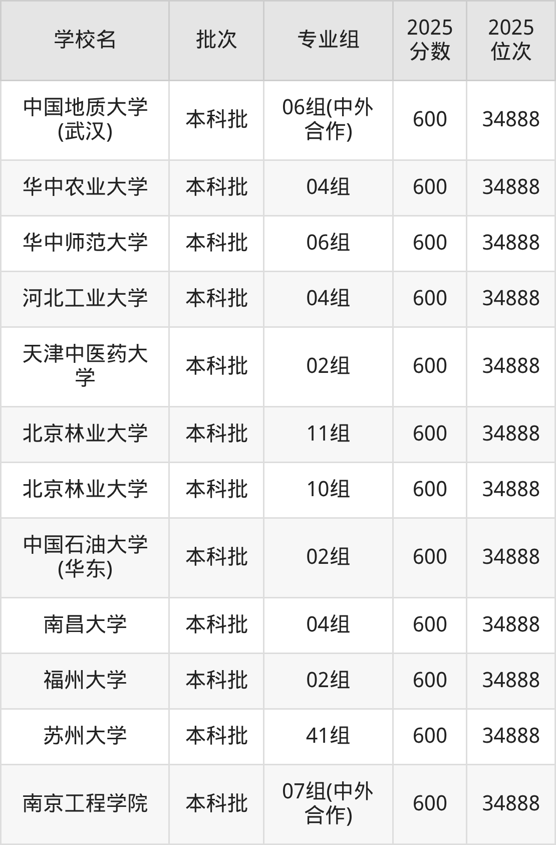 2025年江苏高考物理类600分(33986名~34888名)能上的大学有南京工程学院07组(中外合作)、苏州大学41组、上海理工大学04组(中外合作)、福州大学02组等。