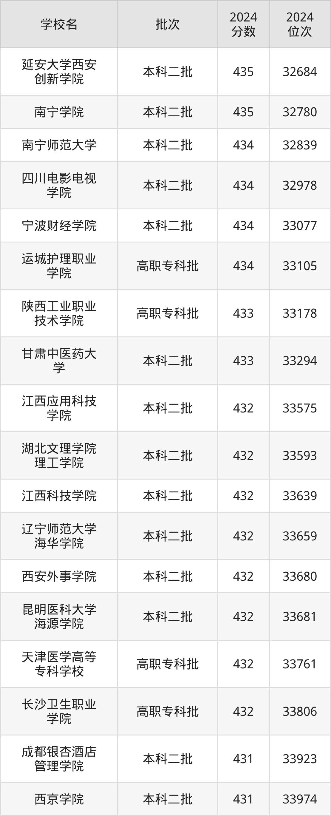 2024年陕西高考文科433分(33145名~33527名)能上的大学有陕西工业职业技术学院、甘肃中医药大学。
