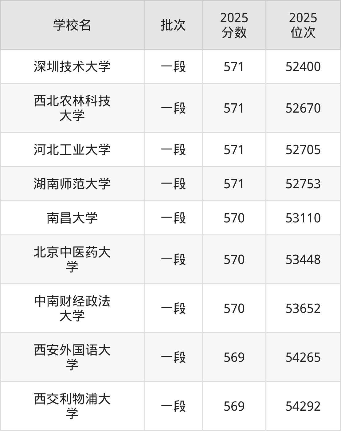 这些都是2026年高考52900名~54127名考生可以报考的大学,更多学校名单如下表所示: