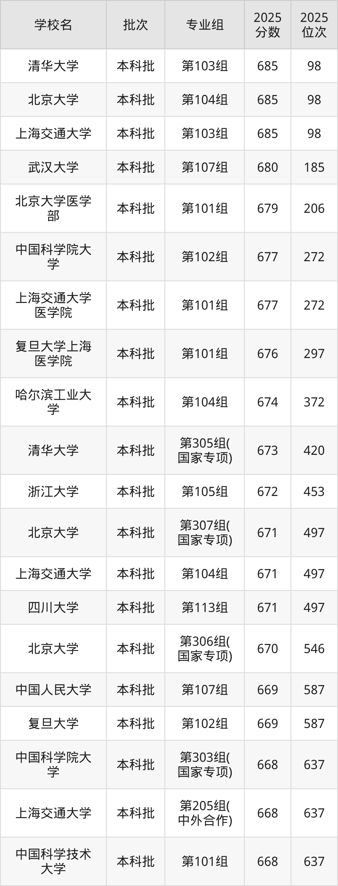2025年湖南高考物理类668分(588名~637名)能上的大学有中国科学院大学第303组(国家专项)、上海交通大学第205组(中外合作)、中国科学技术大学第101组。