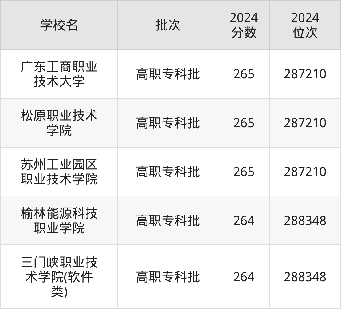 2024年河南高考文科264分(287211名~288348名)能上的大学有三门峡职业技术学院(软件类)、榆林能源科技职业学院。
