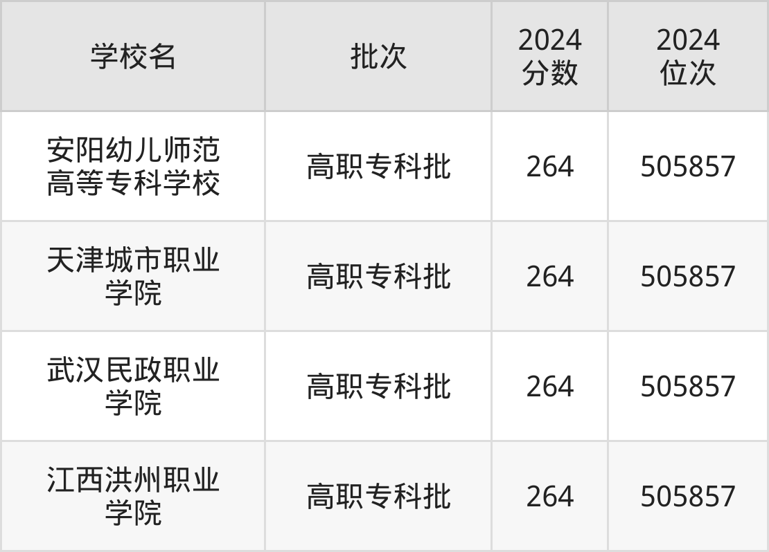 2024年河南高考理科264分(504930名~505858名)能上的大学有武汉民政职业学院、天津城市职业学院、江西洪州职业学院、安阳幼儿师范高等专科学校。