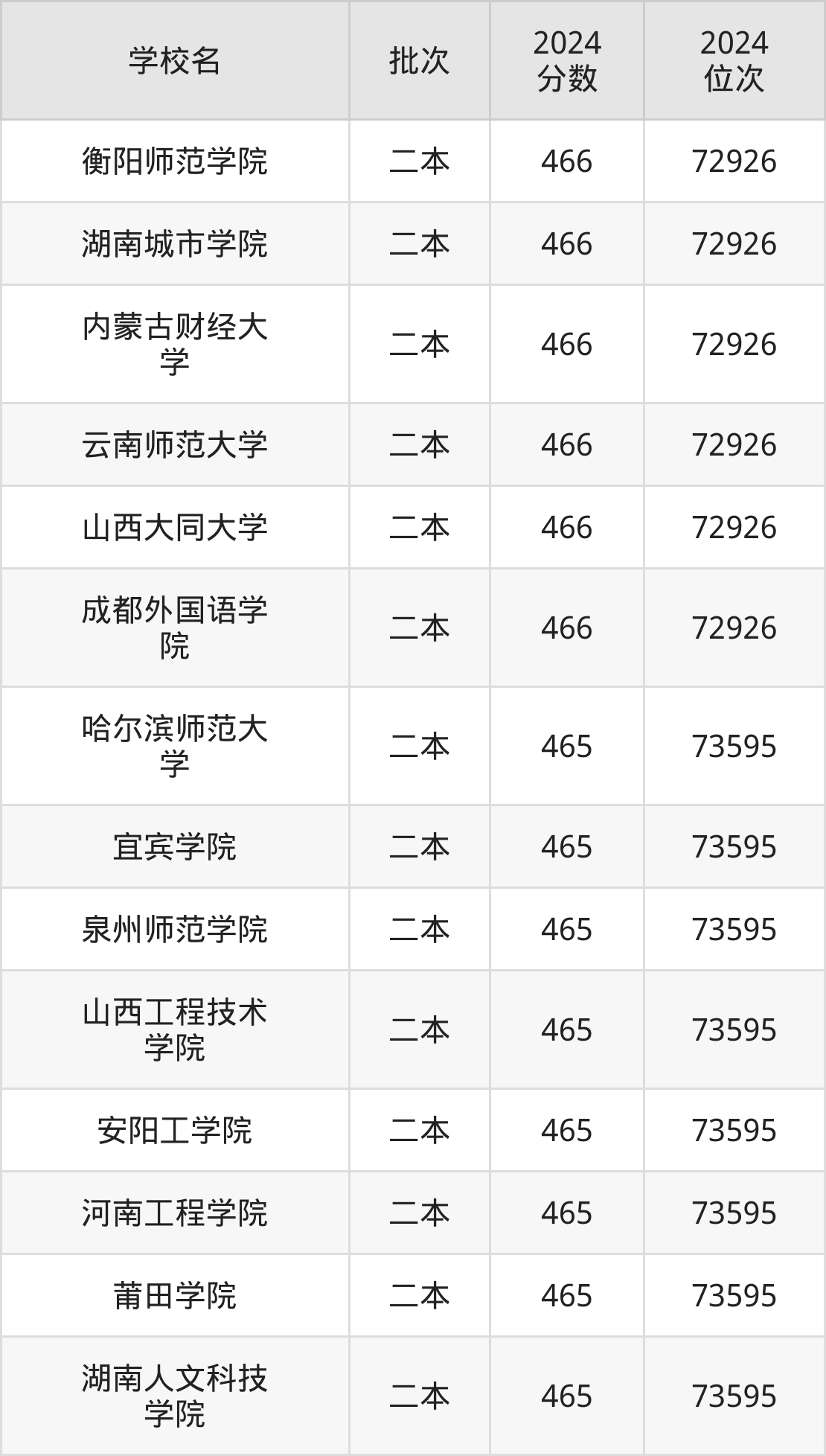 这些都是2025年高考理科72927名~73595名考生可以报考的大学,更多学校名单如下表所示: