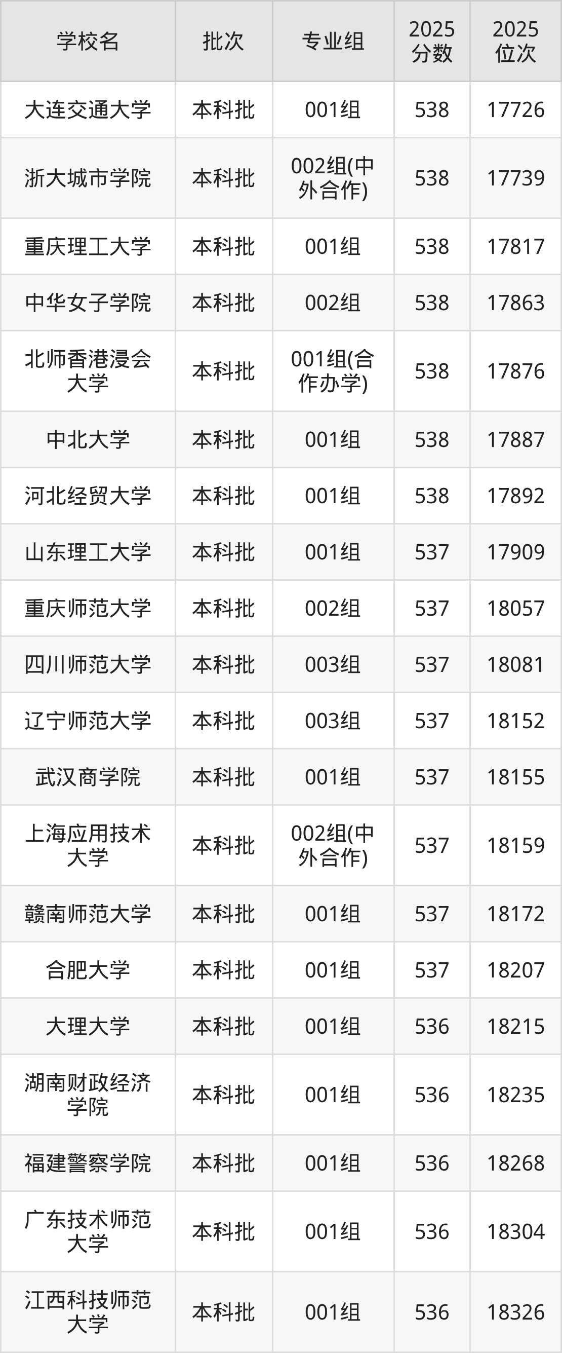 2025年安徽高考历史类536分(18213名~18524名)能上的大学有大理大学001组、福建警察学院001组、广东技术师范大学001组、湖南财政经济学院001组等。