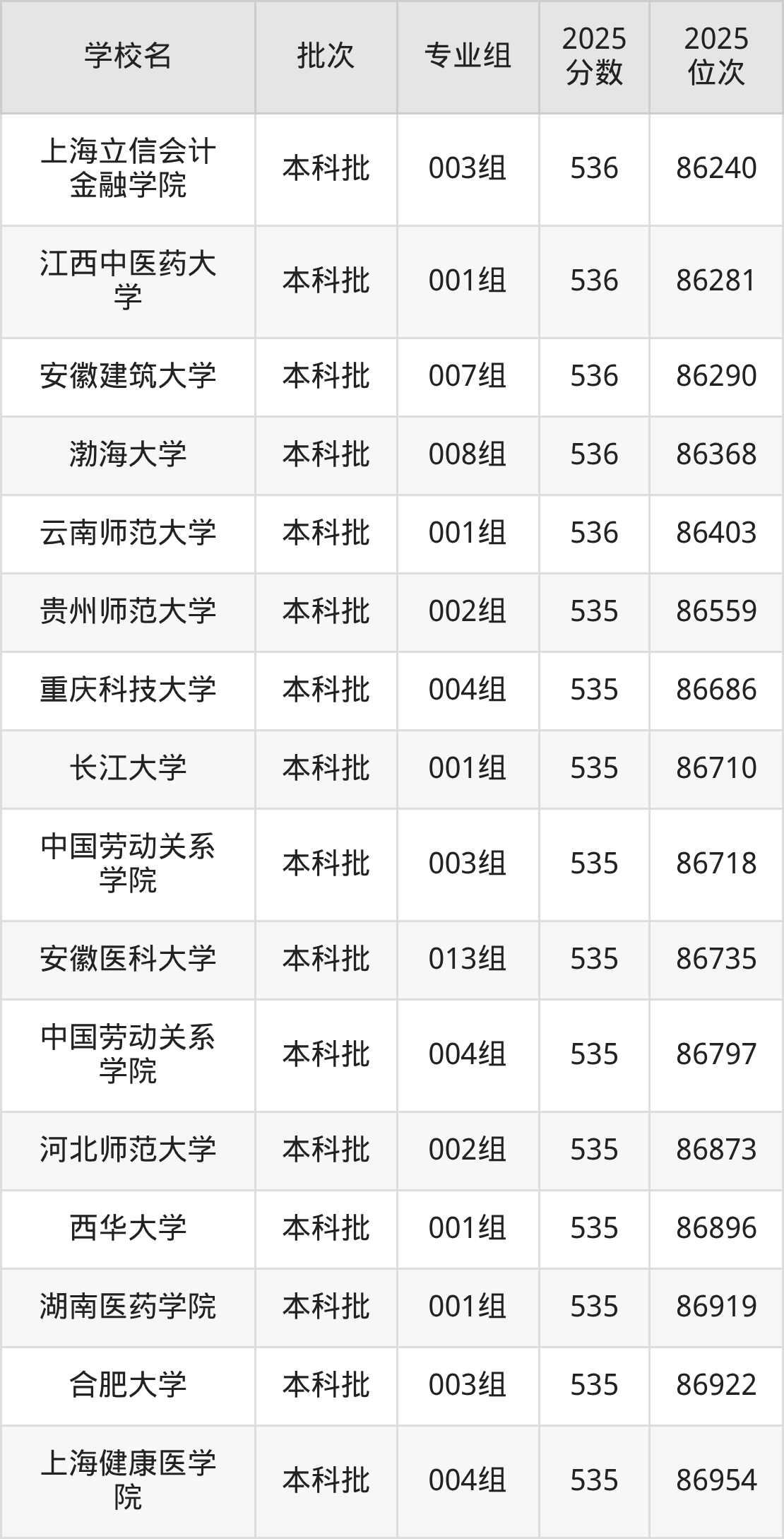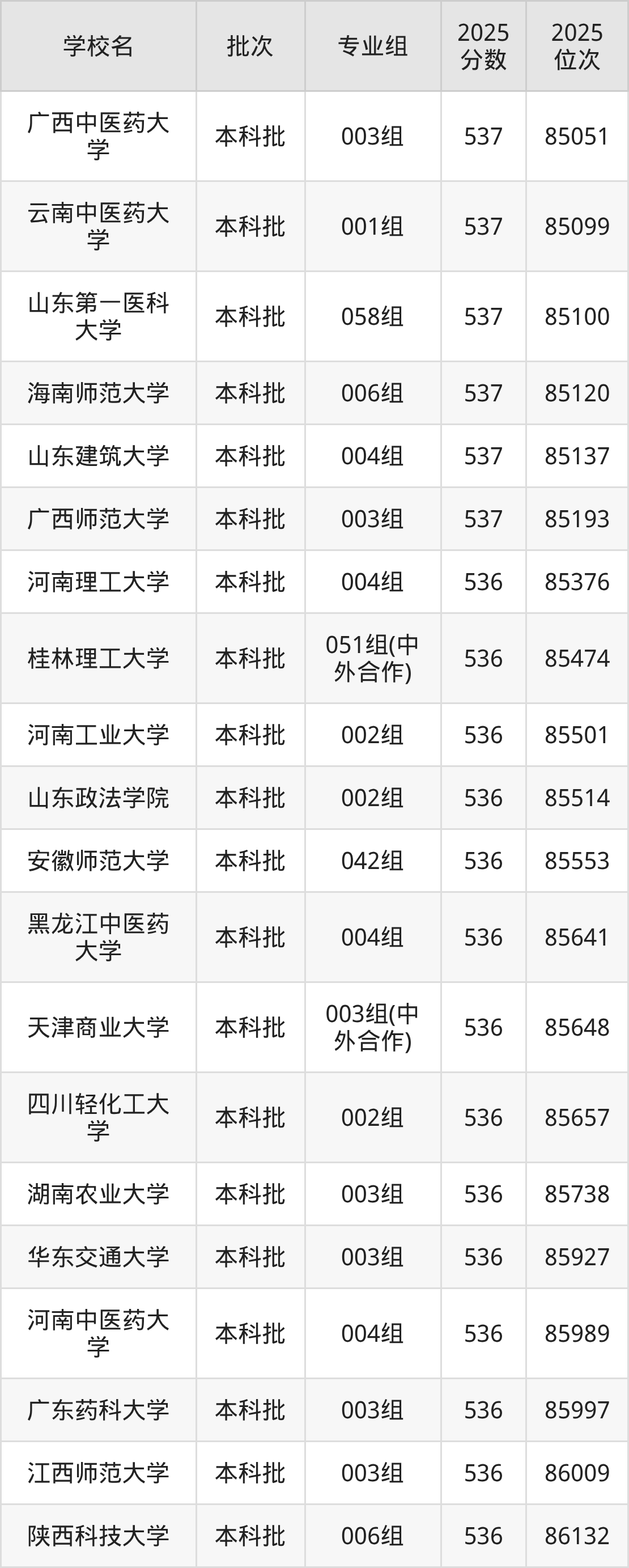2025年安徽高考物理类536分(85341名~86496名)能上的大学有渤海大学008组、广东药科大学003组、桂林理工大学051组(中外合作)、河南工业大学002组等。