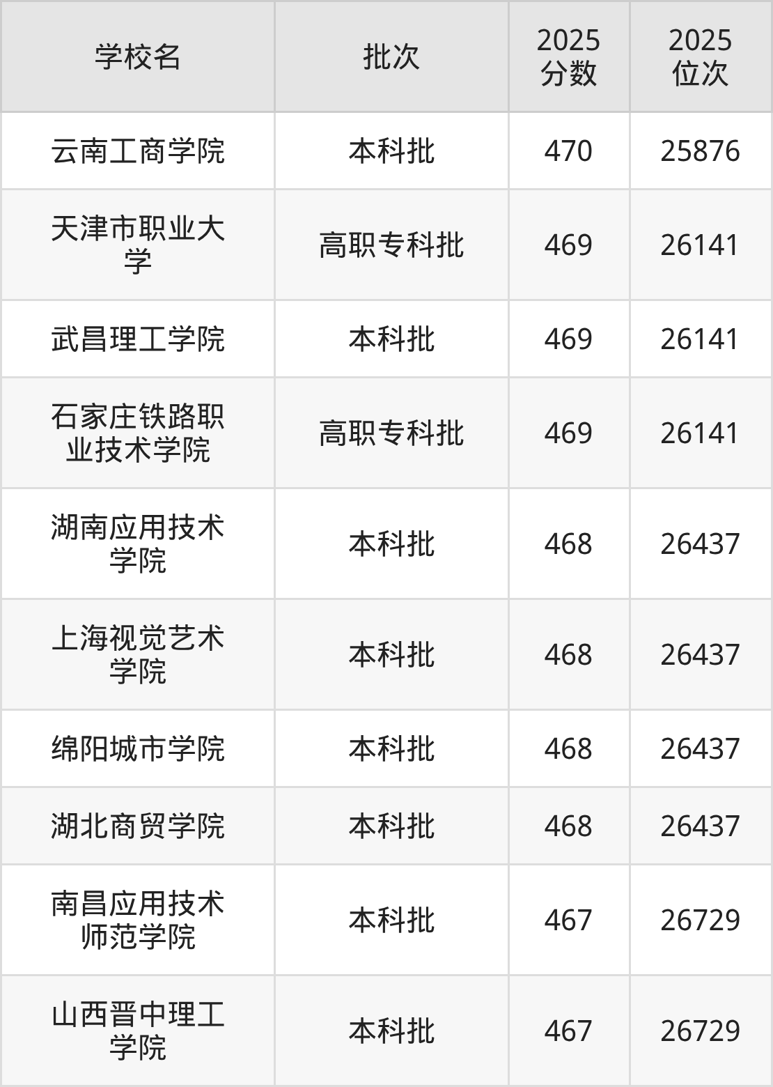 2025年重庆高考历史类468分(26142名~26437名)能上的大学有湖南应用技术学院、上海视觉艺术学院、绵阳城市学院、湖北商贸学院。