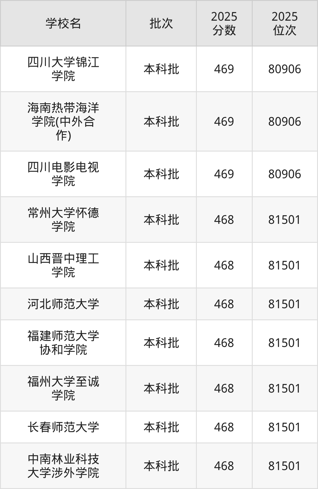 2025年重庆高考物理类468分(80907名~81501名)能上的大学有福建师范大学协和学院、河北师范大学、山西晋中理工学院、福州大学至诚学院等。
