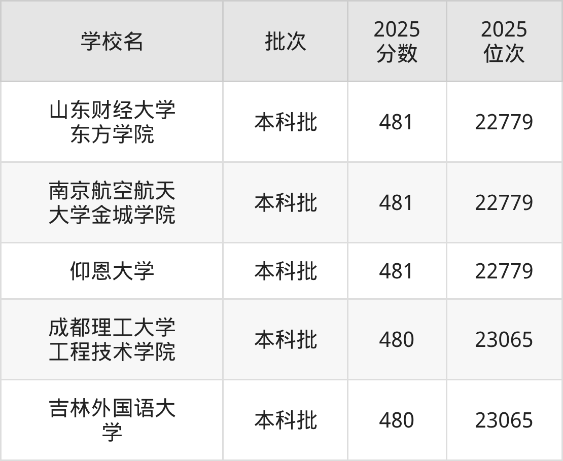 2025年重庆高考历史类480分(22780名~23065名)能上的大学有成都理工大学工程技术学院、吉林外国语大学。