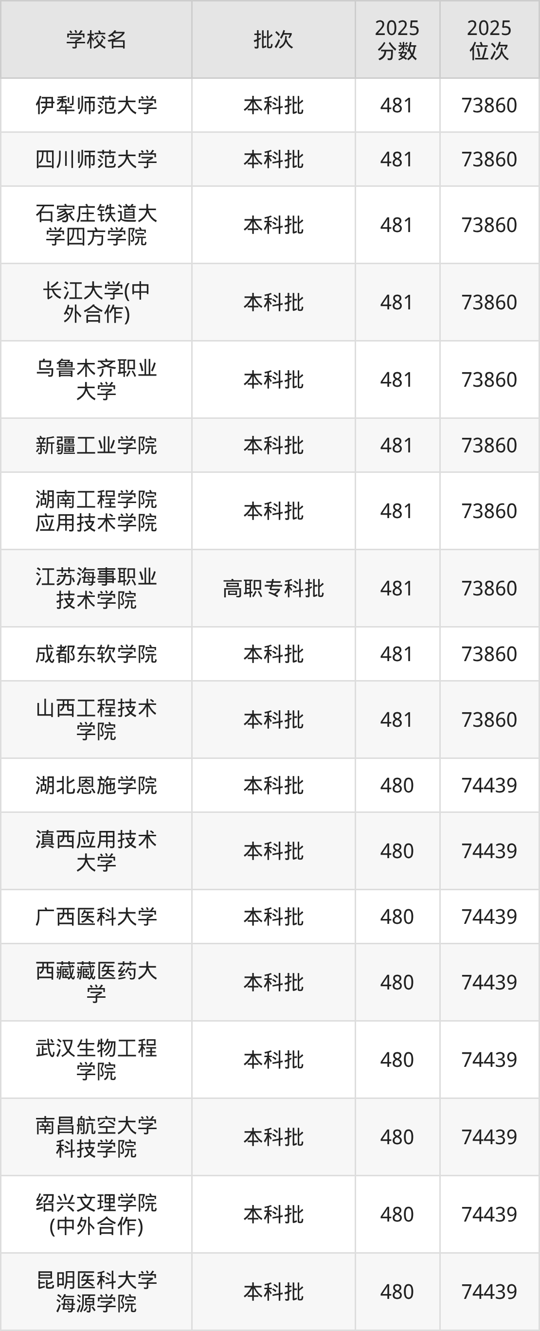 2025年重庆高考物理类480分(73861名~74439名)能上的大学有湖北恩施学院、昆明医科大学海源学院、绍兴文理学院(中外合作)、南昌航空大学科技学院等。