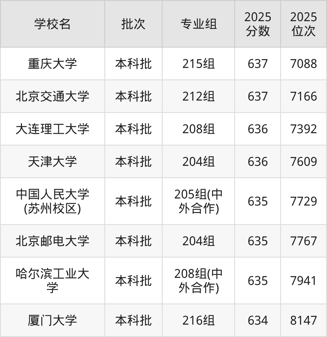 另外录取位次低于该区间(较稳妥)的有中国人民大学(苏州校区)205组(中外合作)(7729名)、北京邮电大学204组(7767名)等;录取位次高于该区间(可冲)的有北京交通大学212组(7166名)、重庆大学215组(7088名)等。