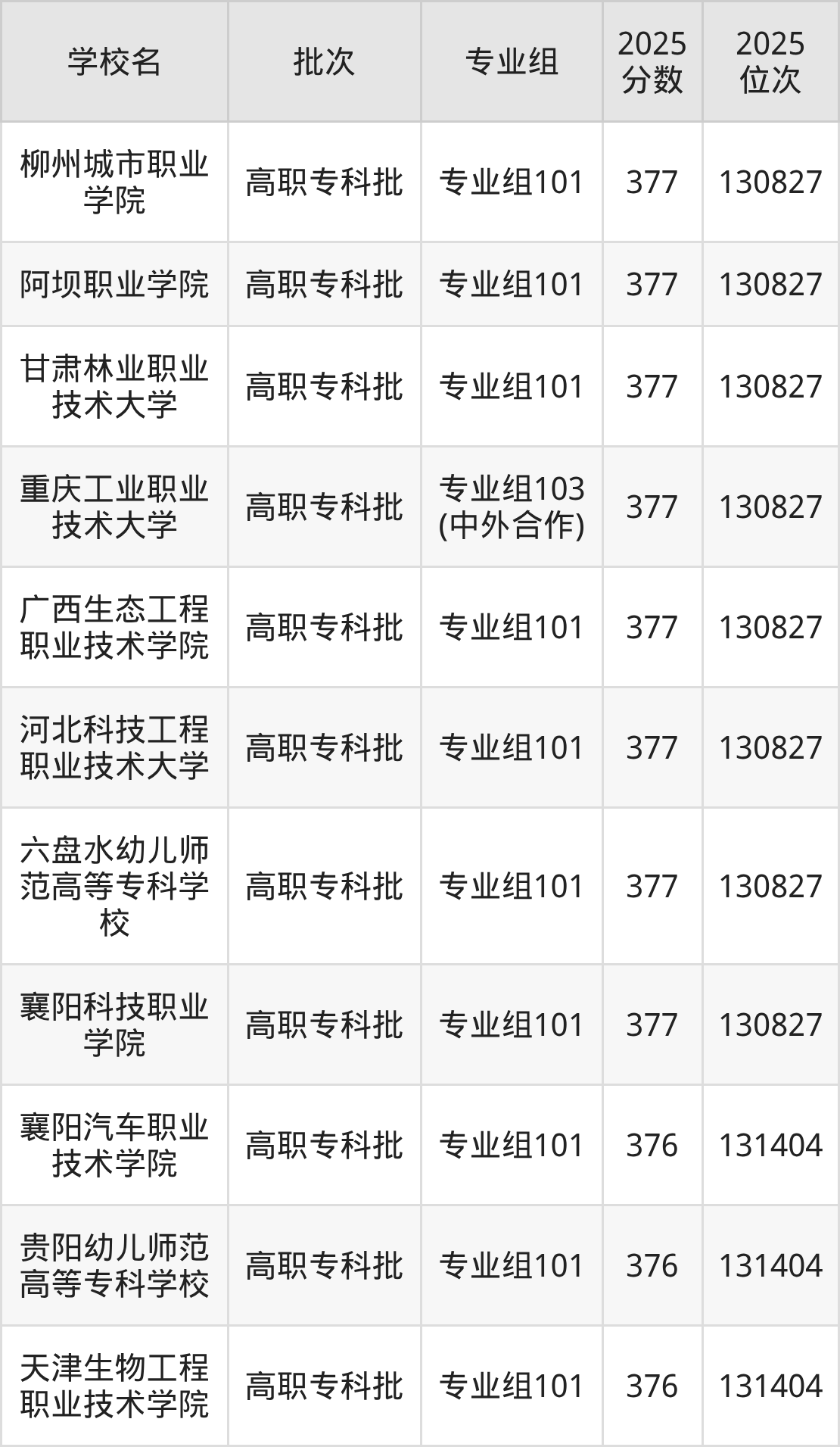 2025年四川高考历史类376分(130828名~131404名)能上的大学有天津生物工程职业技术学院专业组101、贵阳幼儿师范高等专科学校专业组101、襄阳汽车职业技术学院专业组101。