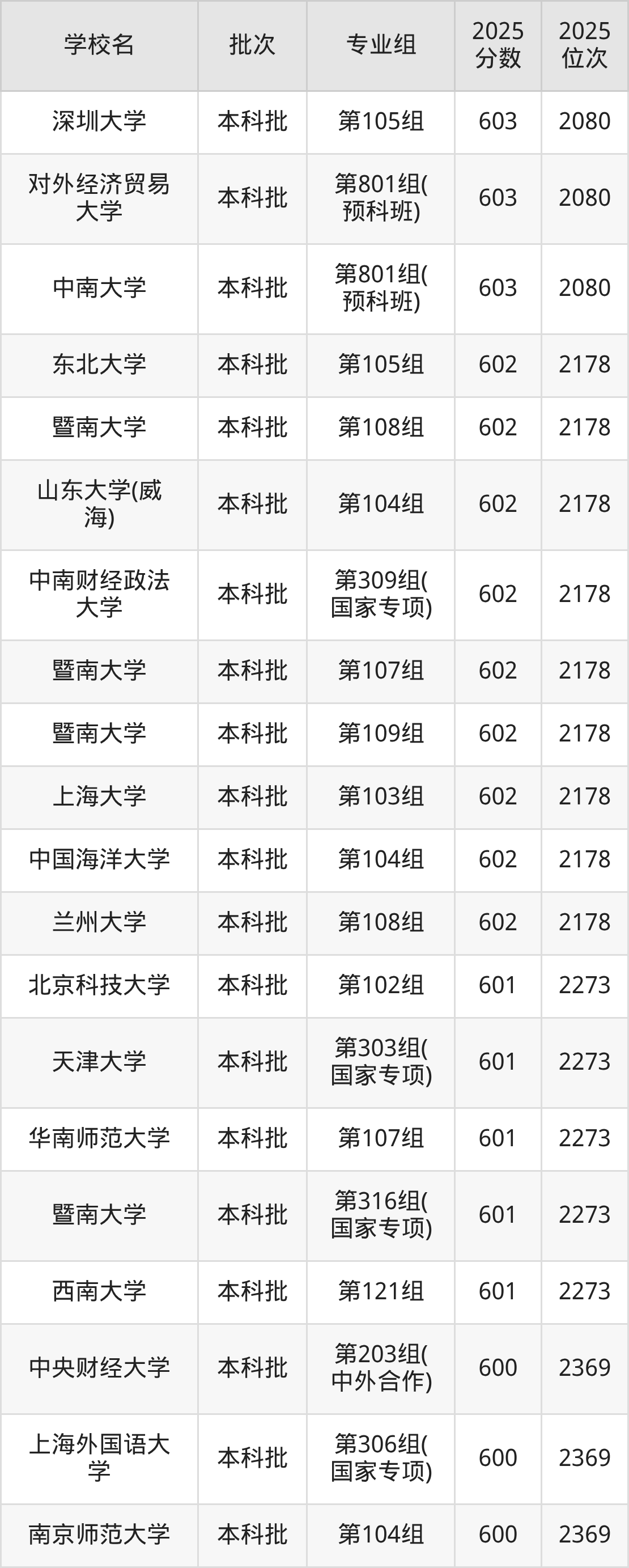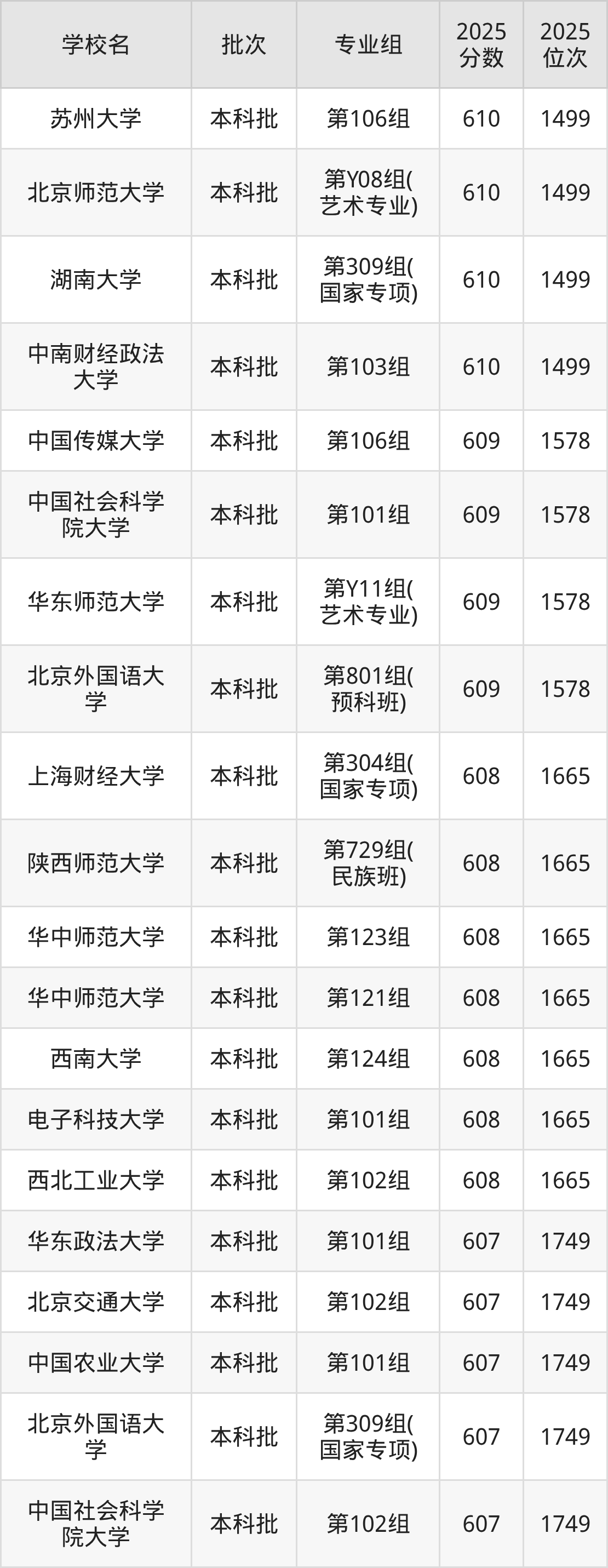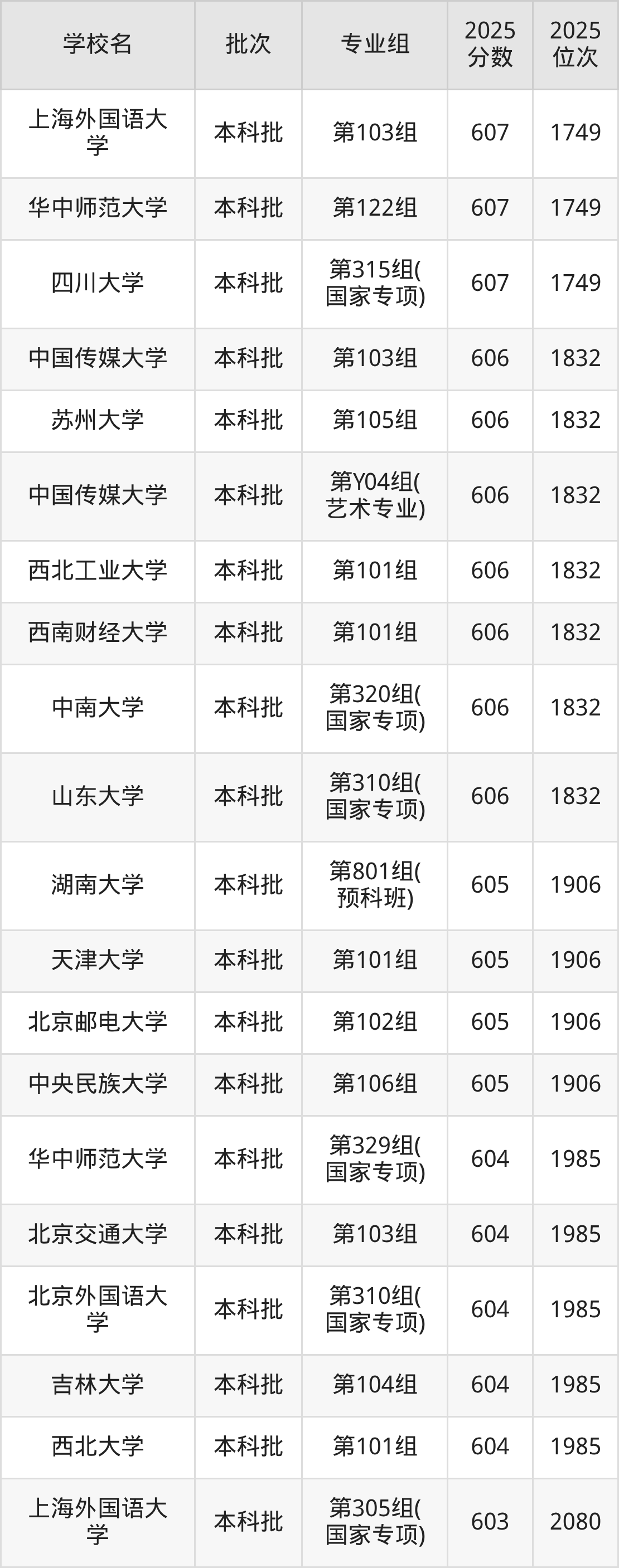 2025年湖南高考历史类604分(1907名~1985名)能上的大学有北京交通大学第103组、北京外国语大学第310组(国家专项)、吉林大学第104组、华中师范大学第329组(国家专项)等。
