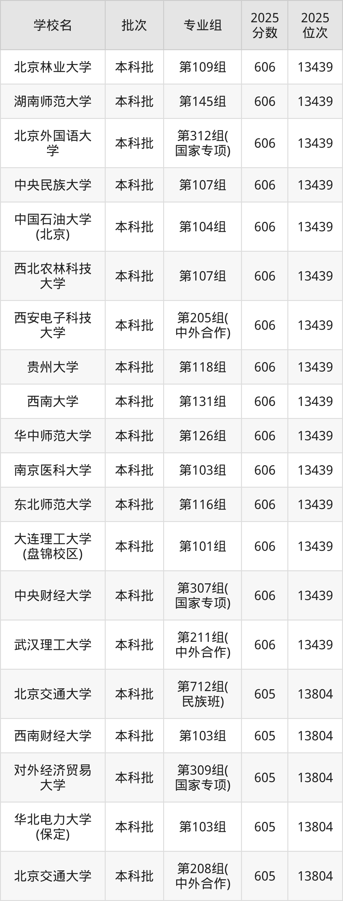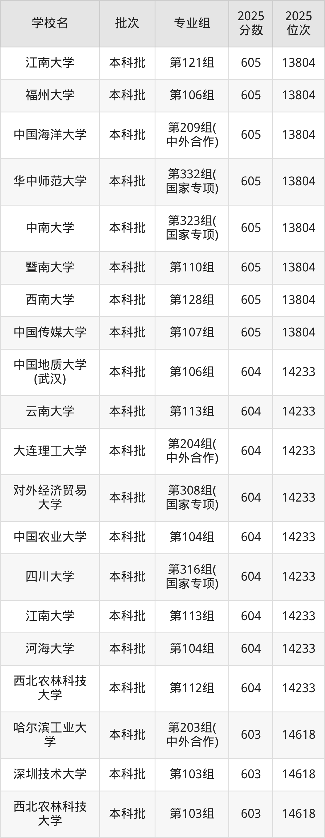 2025年湖南高考物理类604分(13805名~14233名)能上的大学有中国农业大学第104组、对外经济贸易大学第308组(国家专项)、大连理工大学第204组(中外合作)、河海大学第104组等。