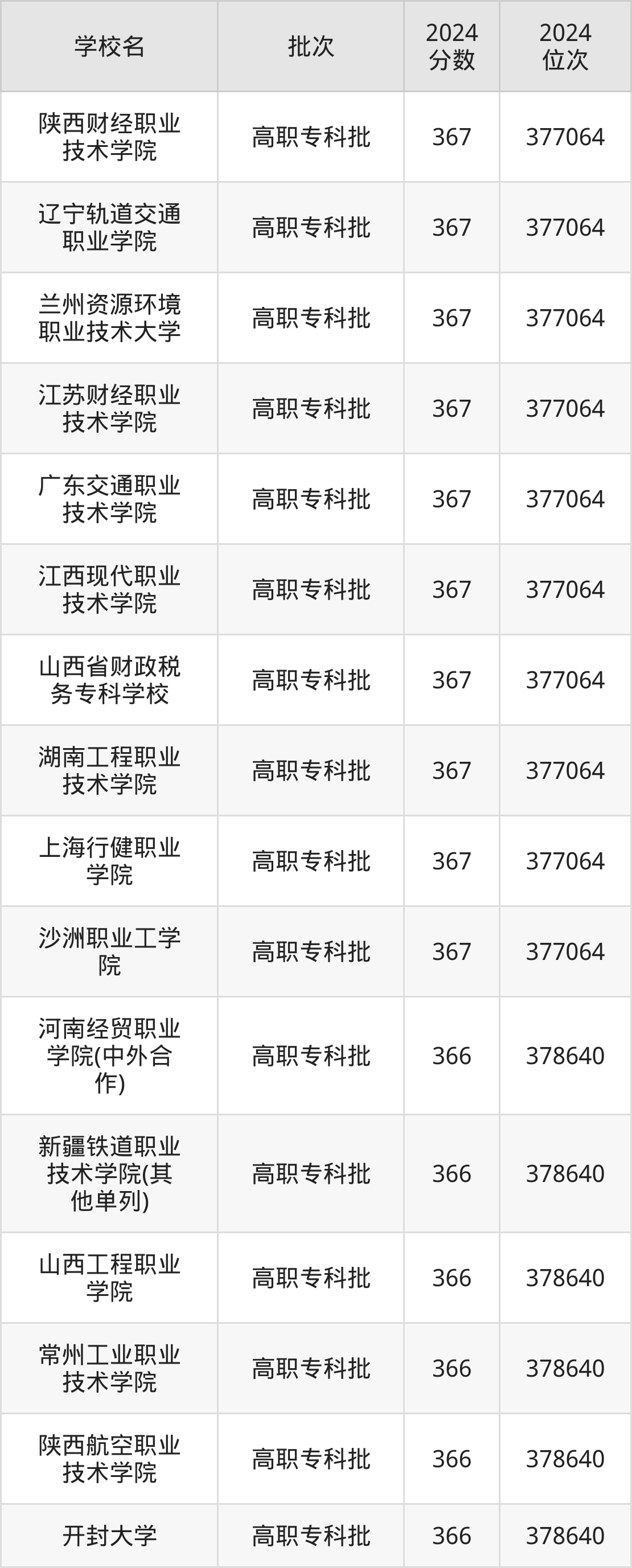 2024年河南高考理科366分(377066名~378641名)能上的大学有常州工业职业技术学院、陕西航空职业技术学院、开封大学、山西工程职业学院等。